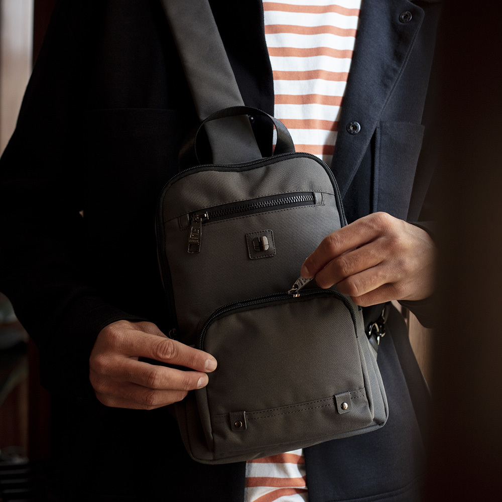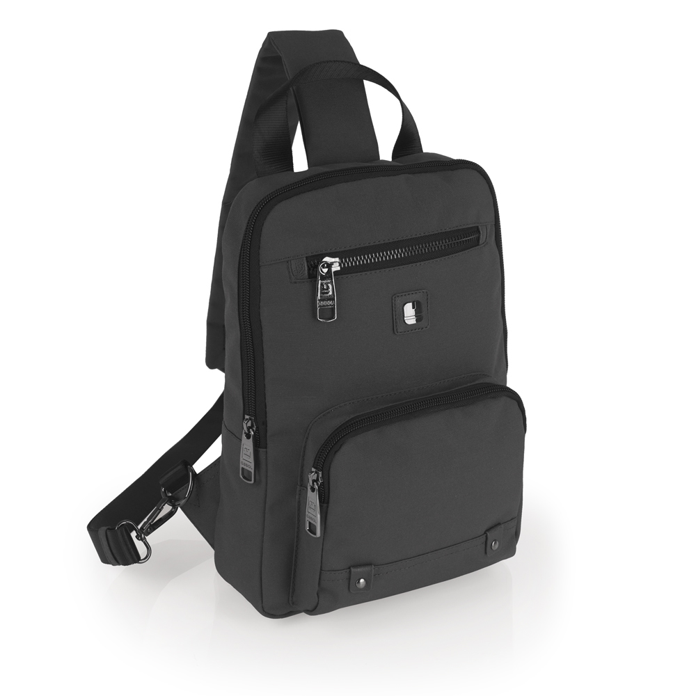 Moderan kompaktan ranac na jedno rame vrhunske izrade, od vodootpornog platna, bez PVC materijala, vodootporan. Kaiš je podesiv po dužini i izrađen od čvrstog materijala i može se premeštati, zahvaljujući prstenovima za kačenje, sa obe strane. Kompaktan dizajn, sa nekoliko praktičnih pregrada, uključujući i prostor za tablet ili kompjuter do 10"