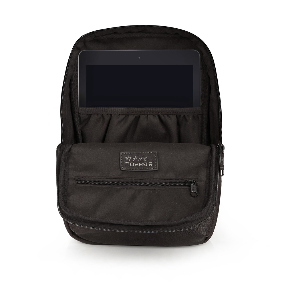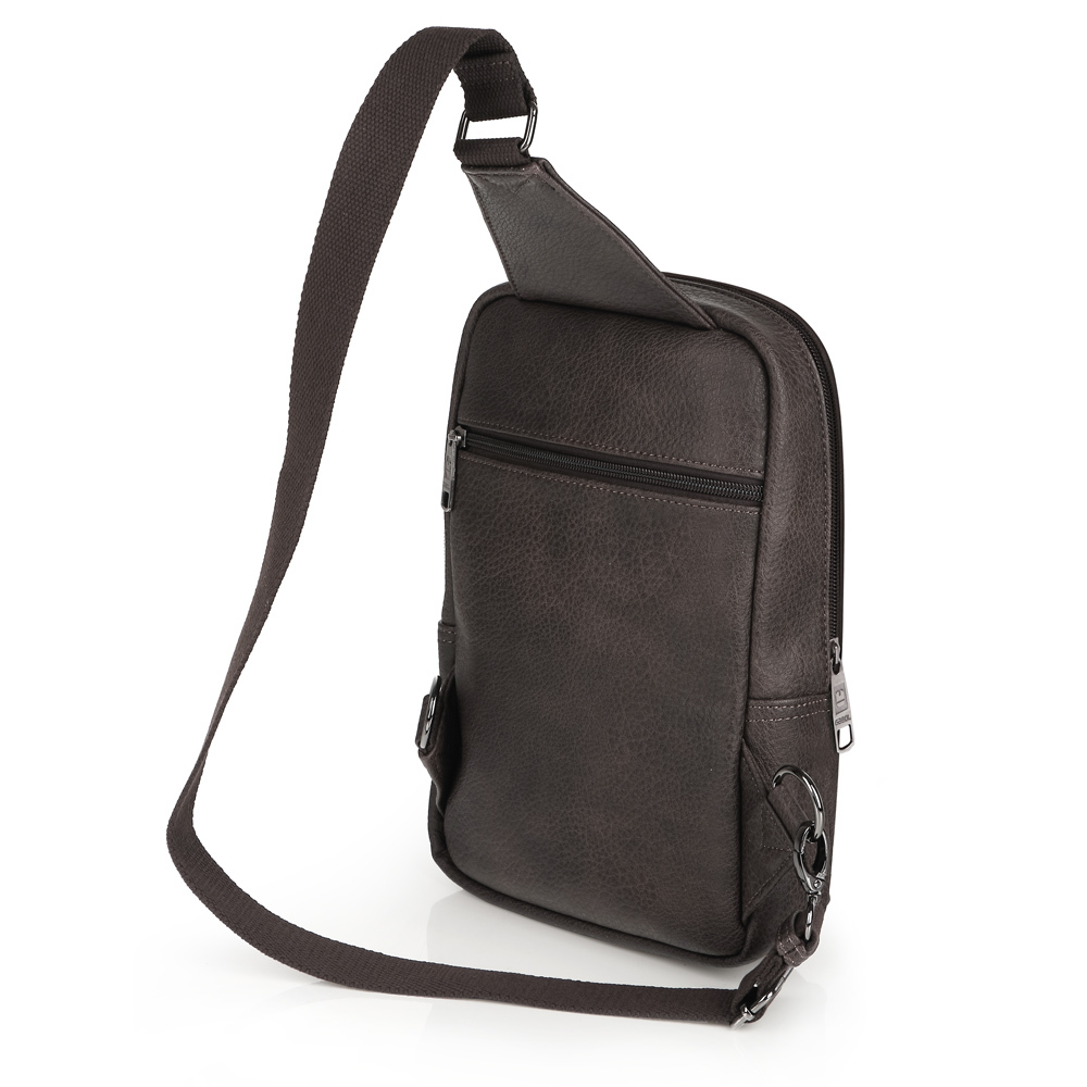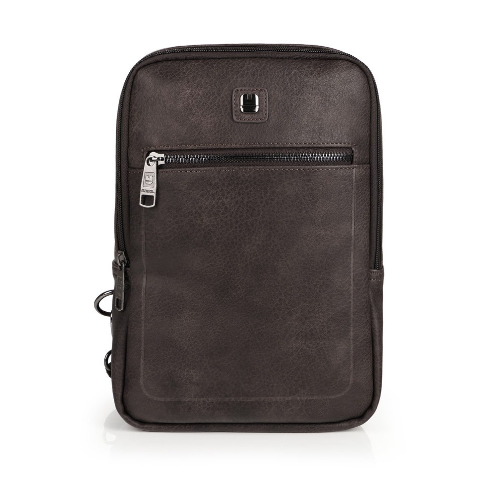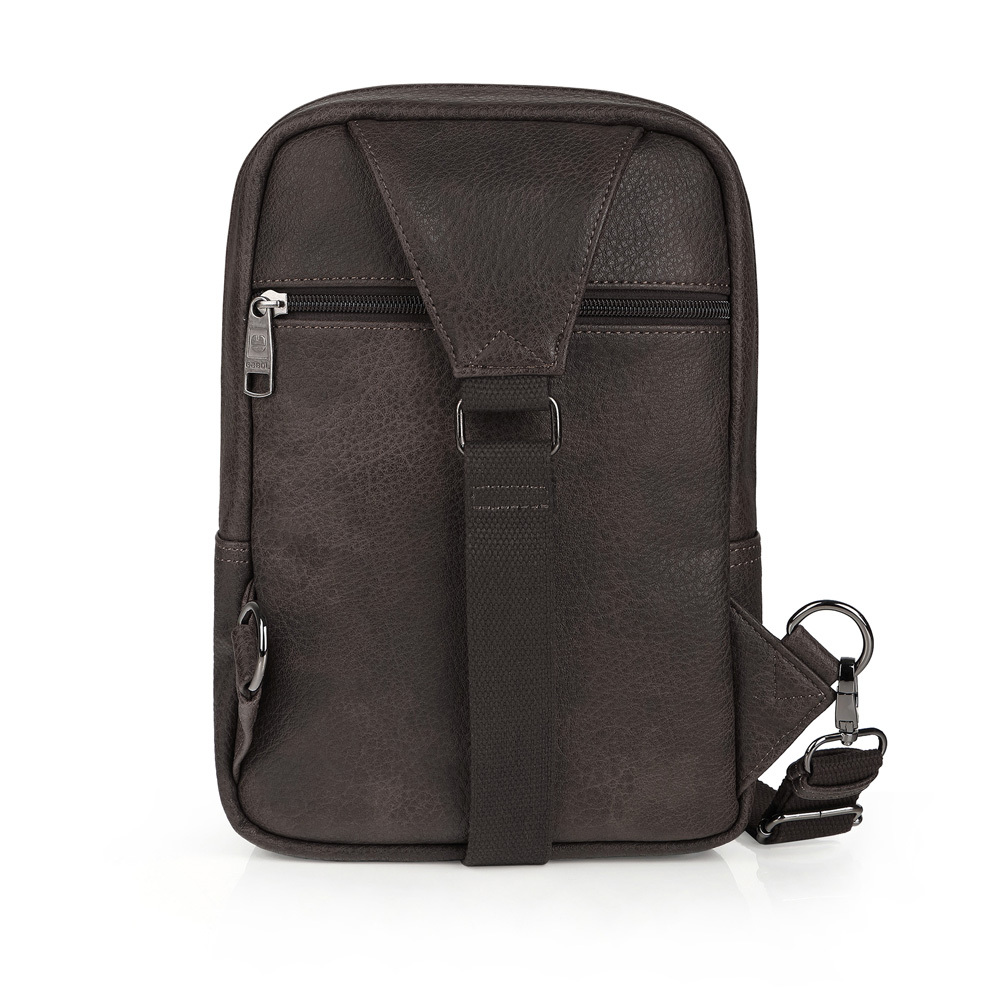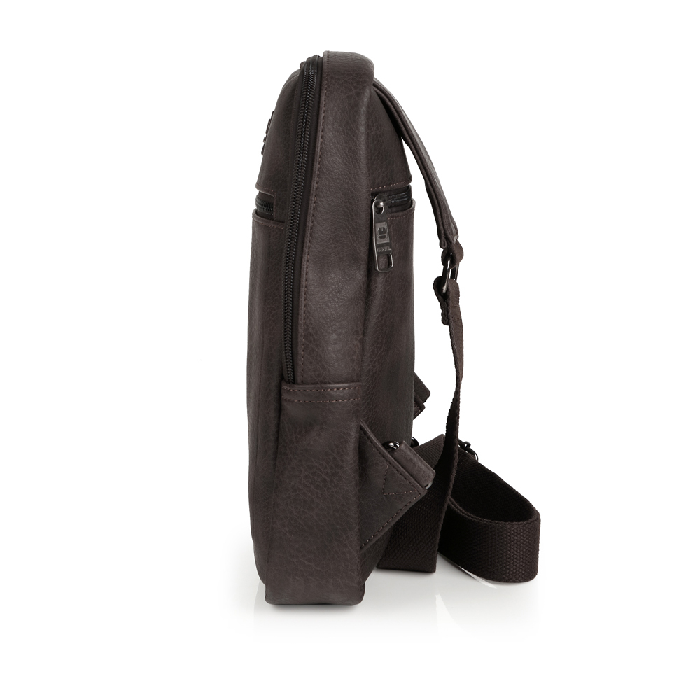 Moderan kompaktan ranac na jedno rame vrhunske izrade, od veštačke kože. Kaiš je podesiv po dužini i izrađen od čvrstog platna, takođe se može premeštati zahvaljujući prstenovima za kačenje, sa obe strane.