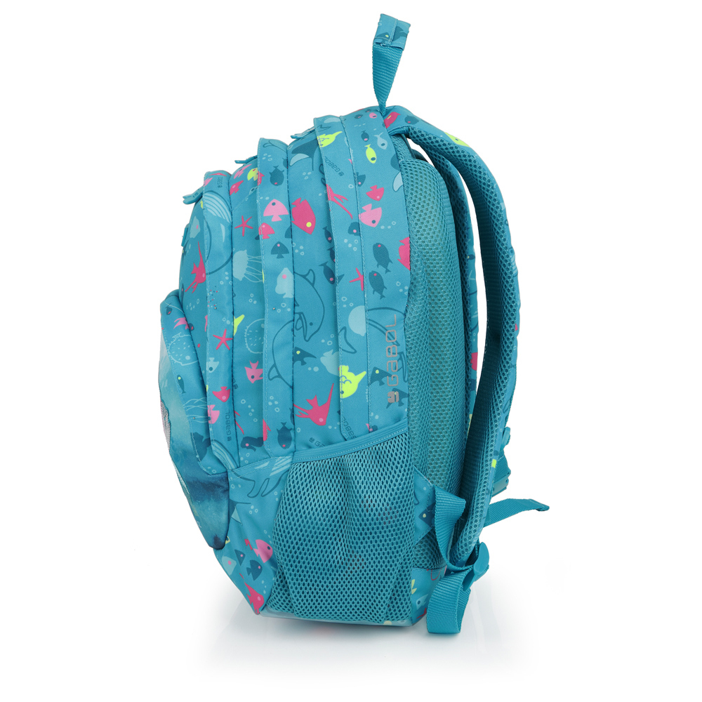Izuzetno lagan i ergonomski dizajniran ranac, pruža maksimalnu udobnost i podršku djacima tokom svakodnevnog nošenja. Moderan plavo-tirkizni dizajn sa motivima inspirisanim prirodom i morem čini ga vizuelno atraktivnim i idealnim za decu koja vole jedinstven stil. Ranac ima anatomski oblikovanu i ojačanu poledjinu, kao i široke, podesive i postavljne naramenice koje ravnomerno rasporedjuju težinu i smanjuju opterećenje na ledjima. Glavni prostor je prostran i organizovan, idealan za knjige i sveske. Dodatne dve pregrade sa prednje strane sa rajsferšlusom i bočni mrežasti džepovi omogućavaju lako odlaganje školskog pribora i flašice za vodu. Napravljen je od kvalitetnog i izdržljivog materijala koji je otporan na habanje i vremenske uslove. Savršen izbor za svakog djaka.