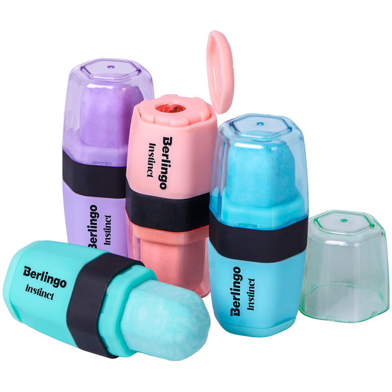 Rezač sa gumicom iz serije Instict. Dvobojno plastično kućište je napravljeno od mekog sloja na dodir. Pastelne boje u kombinaciji sa crnom: roze, lavanda, mente, akvamarina. Na jednoj strani je gumica a sa druge rezač sa jednom rupom, izmedju se nalazi kontejner.