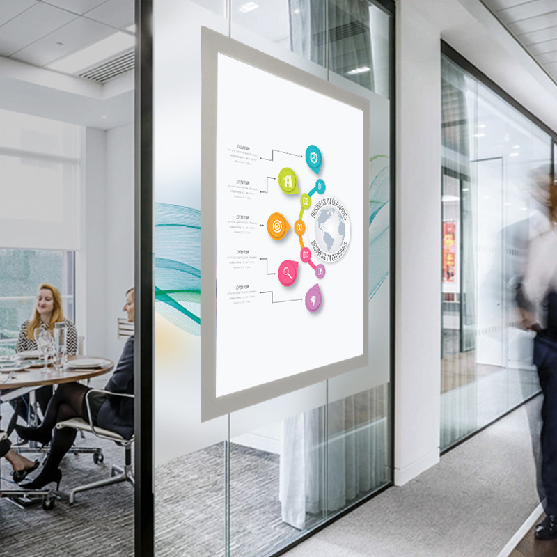 Potpuno samolepljiva providna pozadina. Prednja strana od PVC-a debljine 0,3 mm sa okvirom širine 15 mm. Jedna kraća strana je fiksna a ostale tri strane se zatvaraju magnetom.
