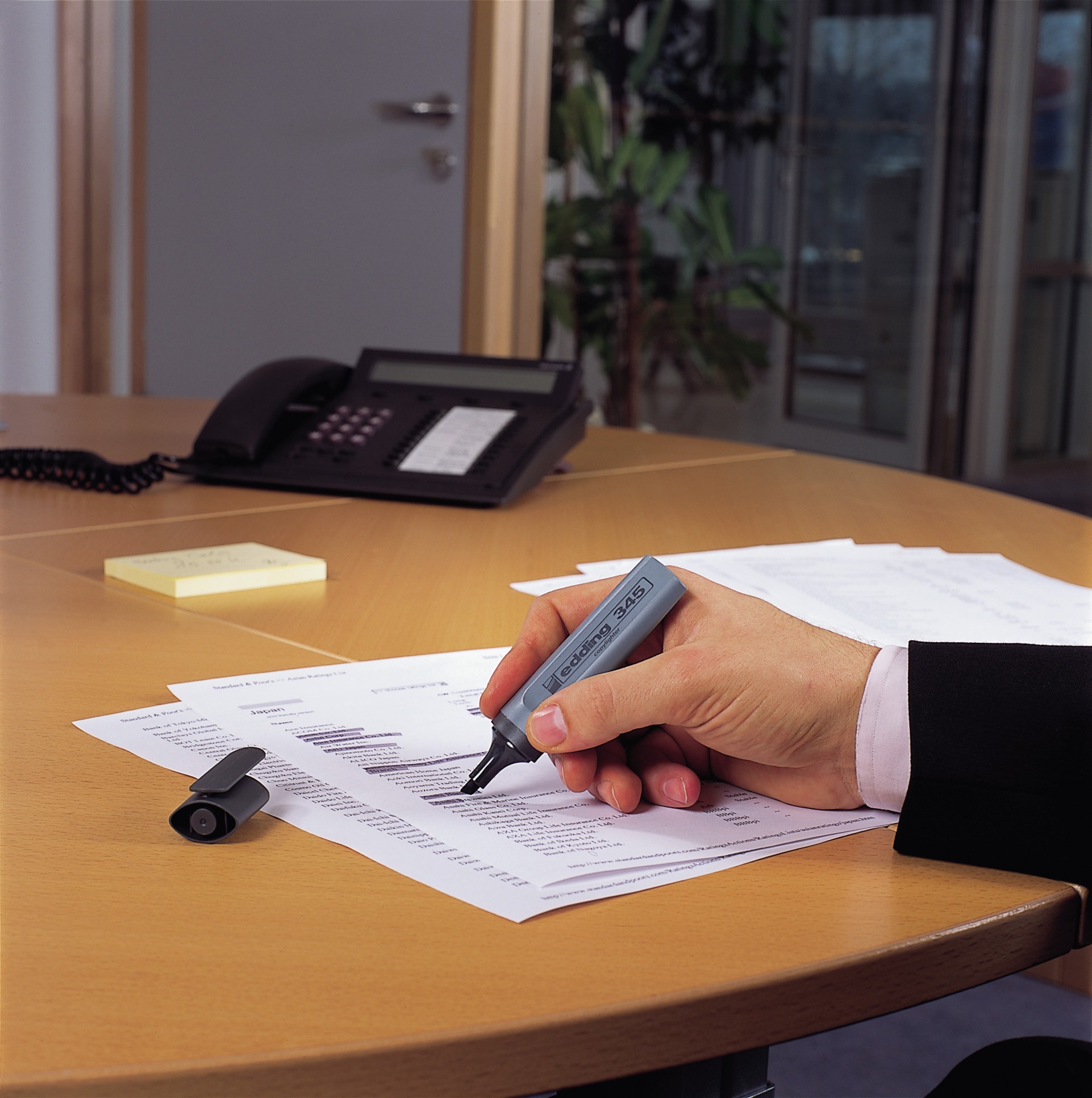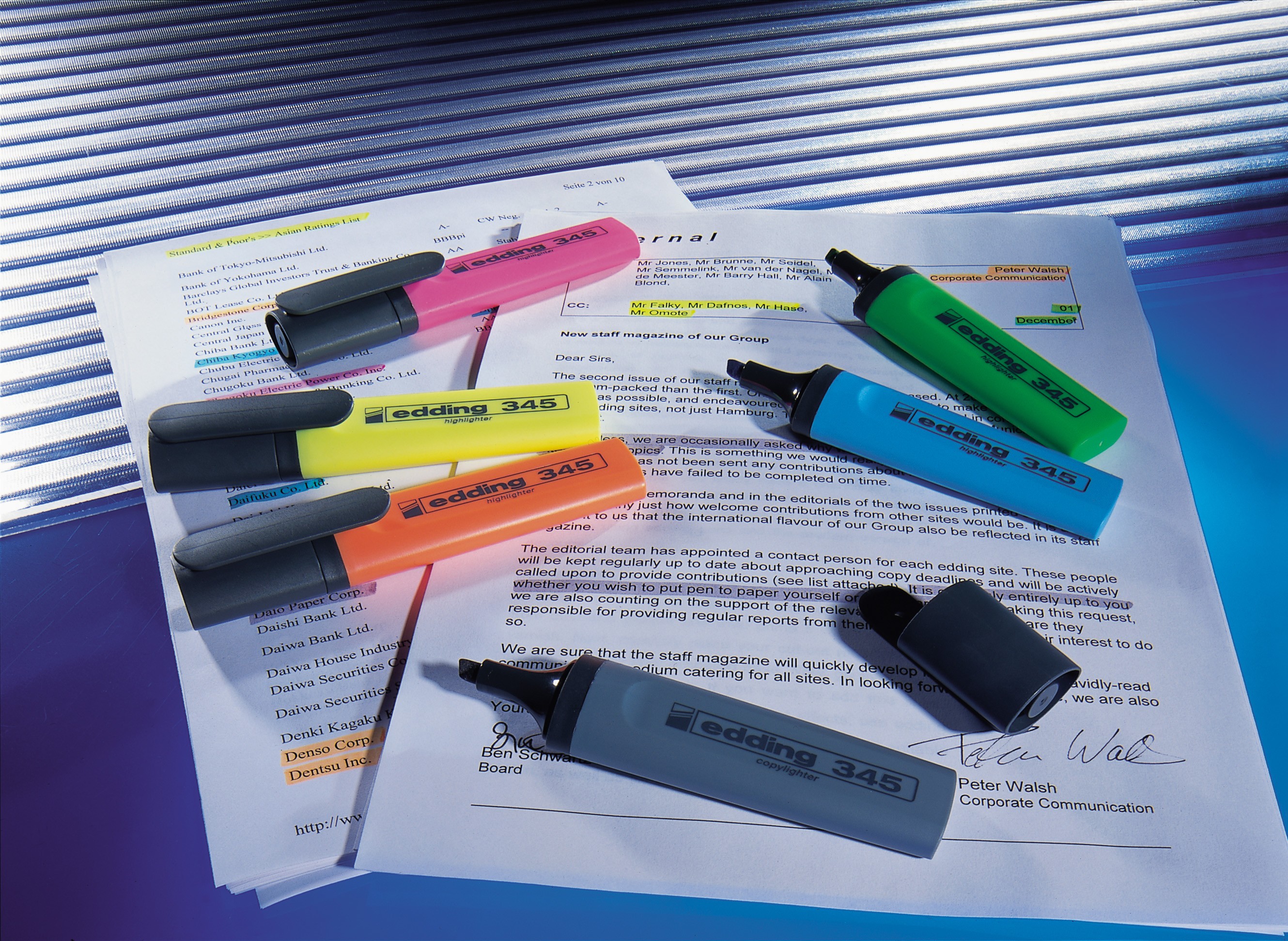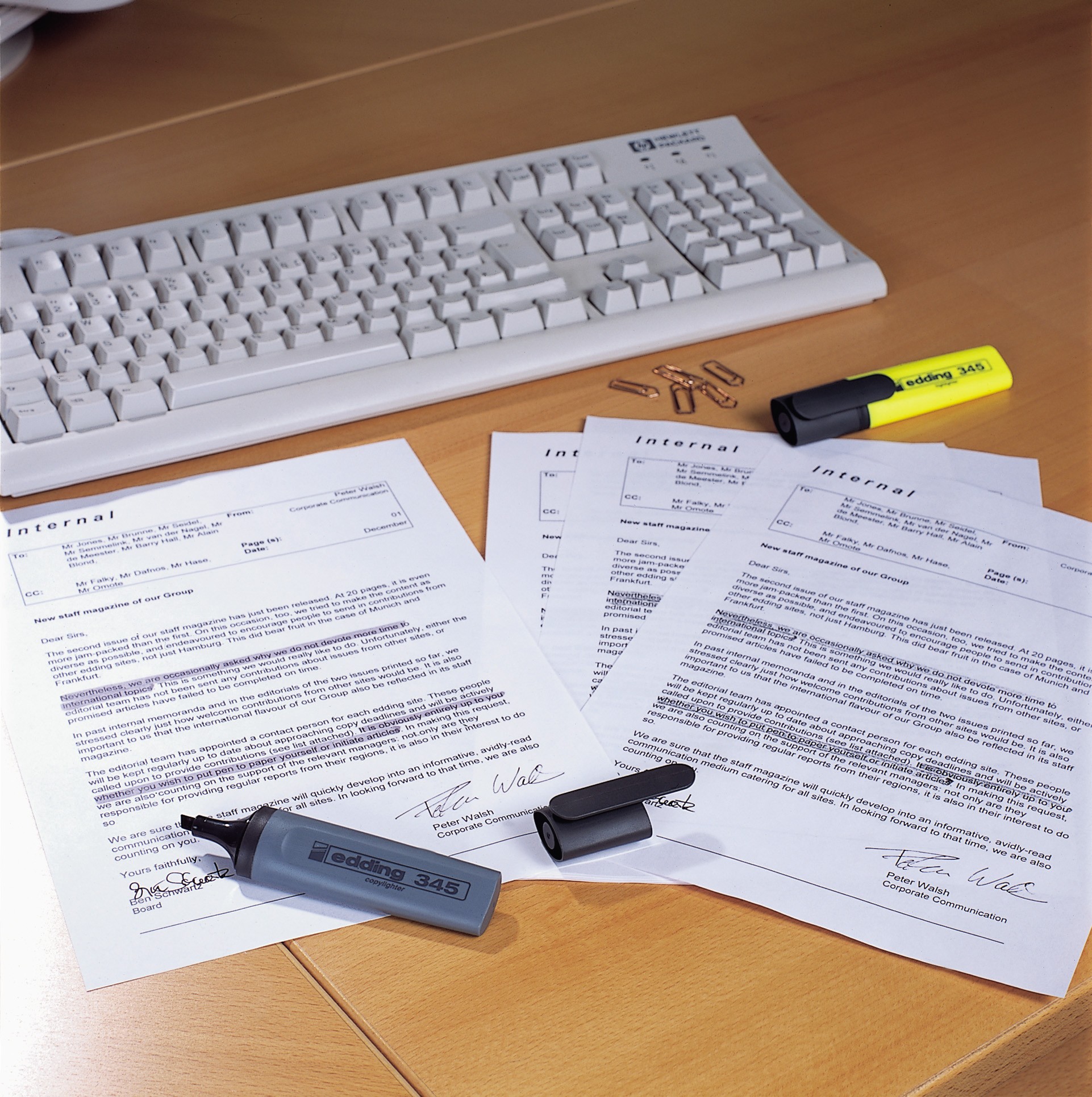 Marker za jasne oznake i isticanje tekstova i beleški na skoro svim papirnim površinama. Vrh ima širinu linije od 2 do 5 mm. Briljantno neonsko mastilo je na bazi vode i ima visok nivo sjaja boje. Može se koristiti na materijalima odštampanim na ink jet štampačima, a siva boja se vidi prilikom kopiranja. Poklopac ima klipsu - idealno za pričvršćivanje na držač olovke ili sveske.