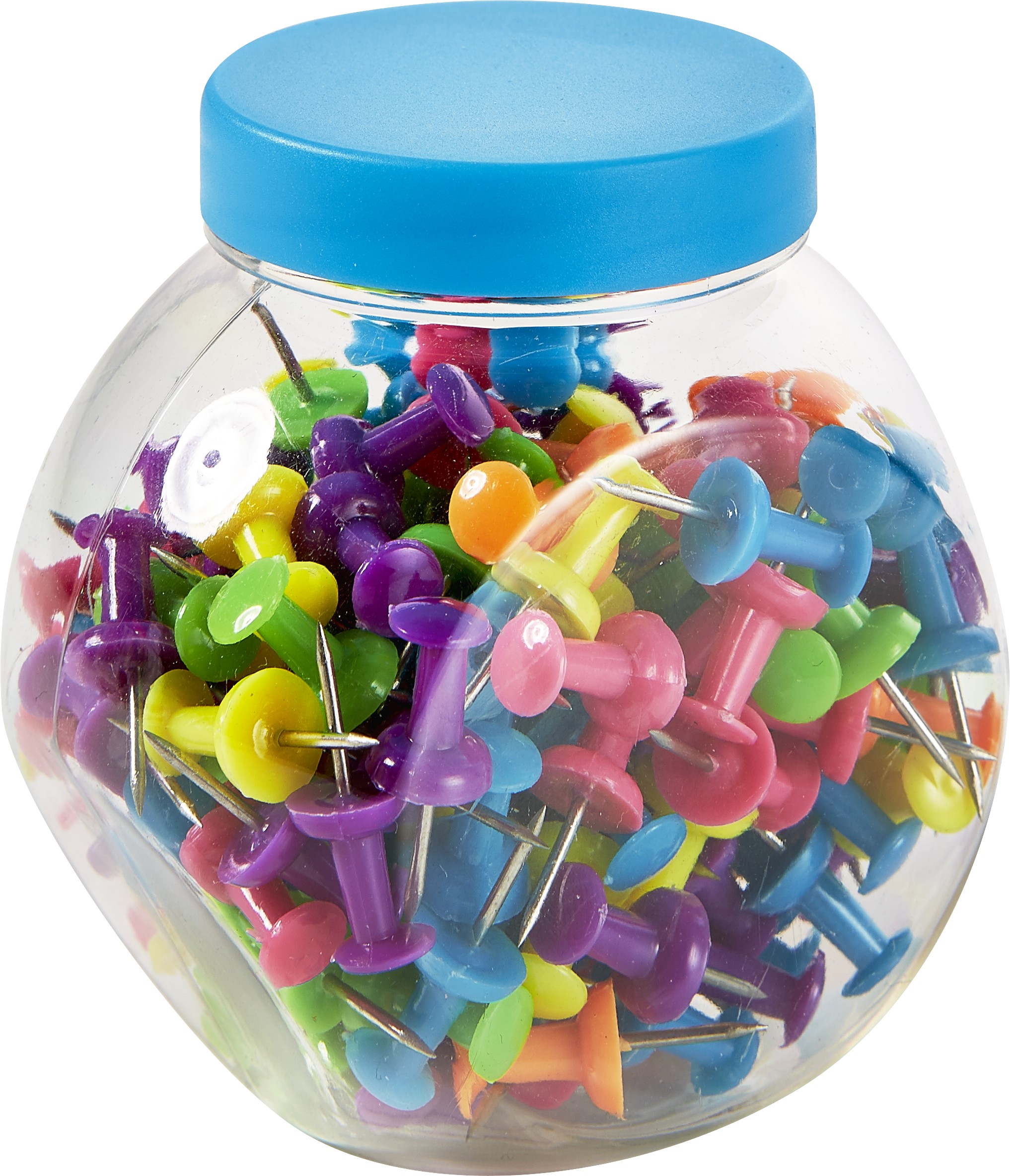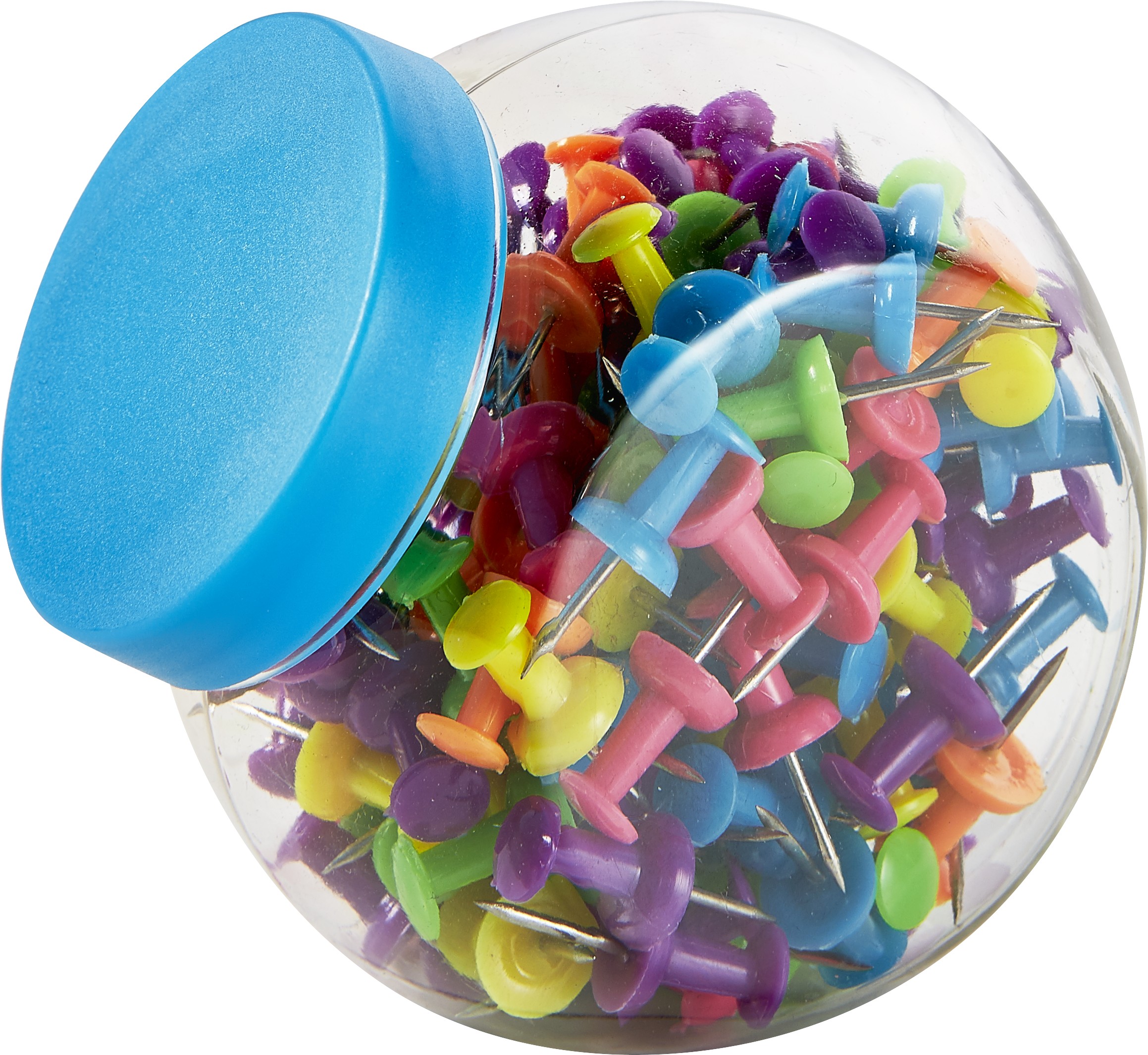 Špenadle za tablu od plute NEON, sa širokom plastičnom glavom, upakovane u praktičnu teglica od 150 komada.