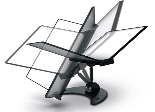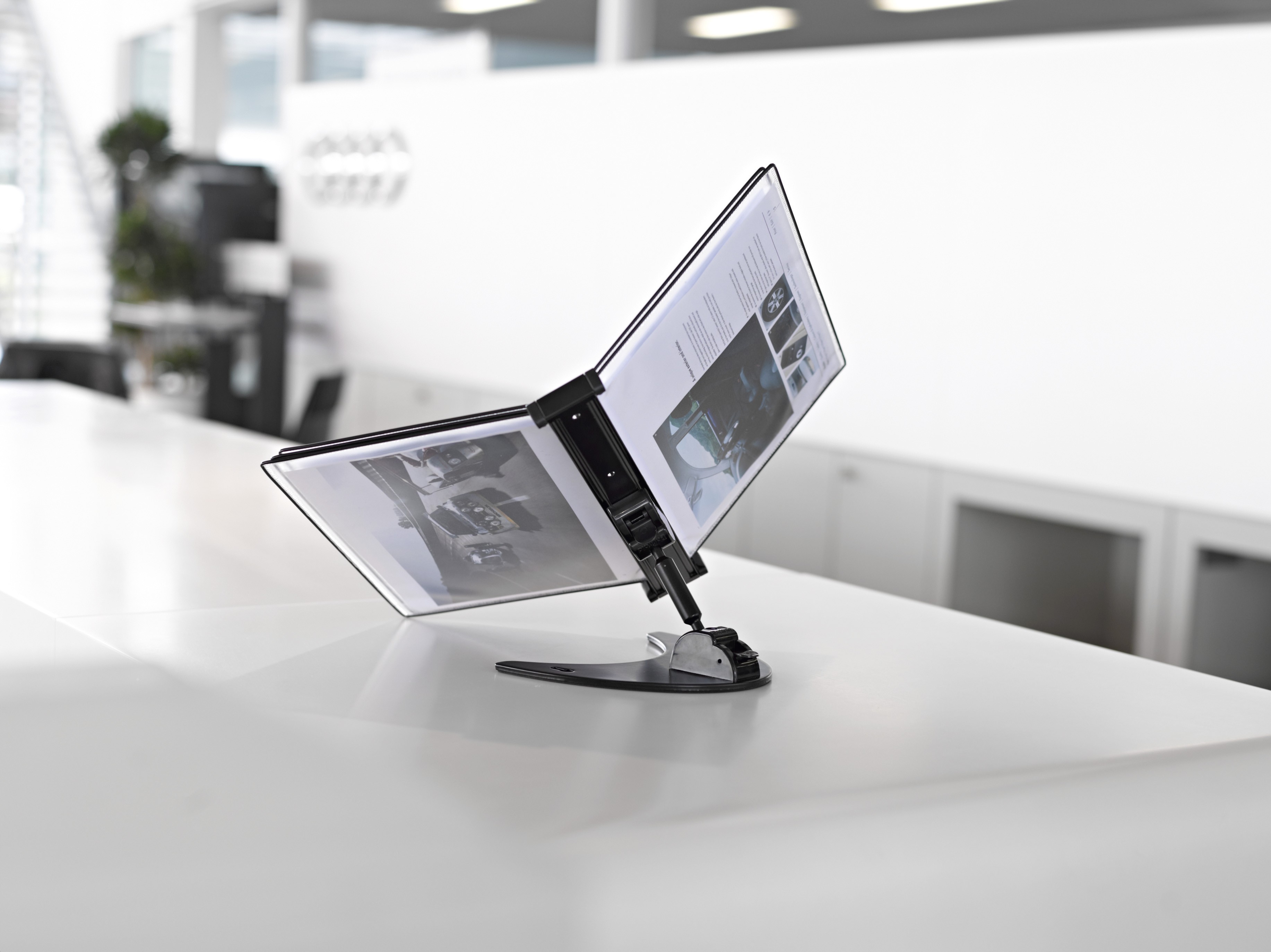 Stoni nosač sa 10 crnih ramova A4 formata sa posebnim zglobovima, pomoću kojih se može menjati orijentacija ramova. Može se montirati i na bilo koju vertikalnu površinu.