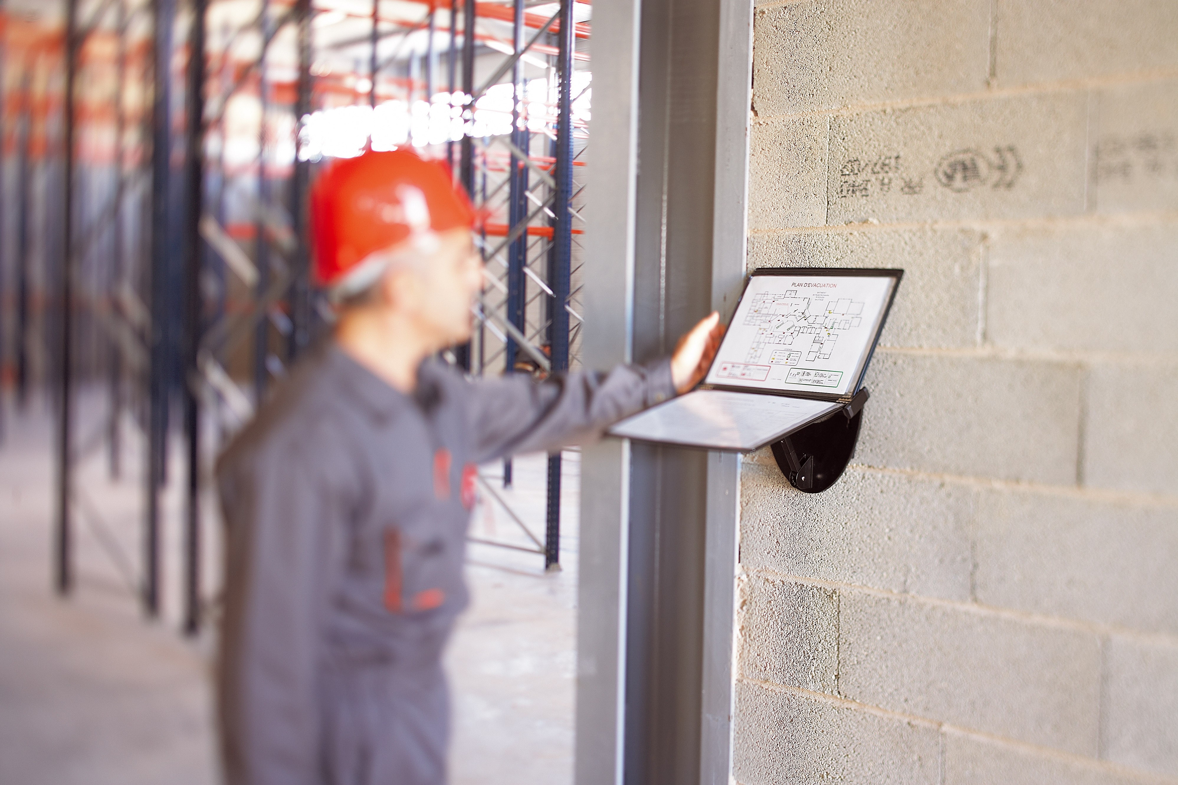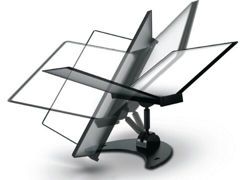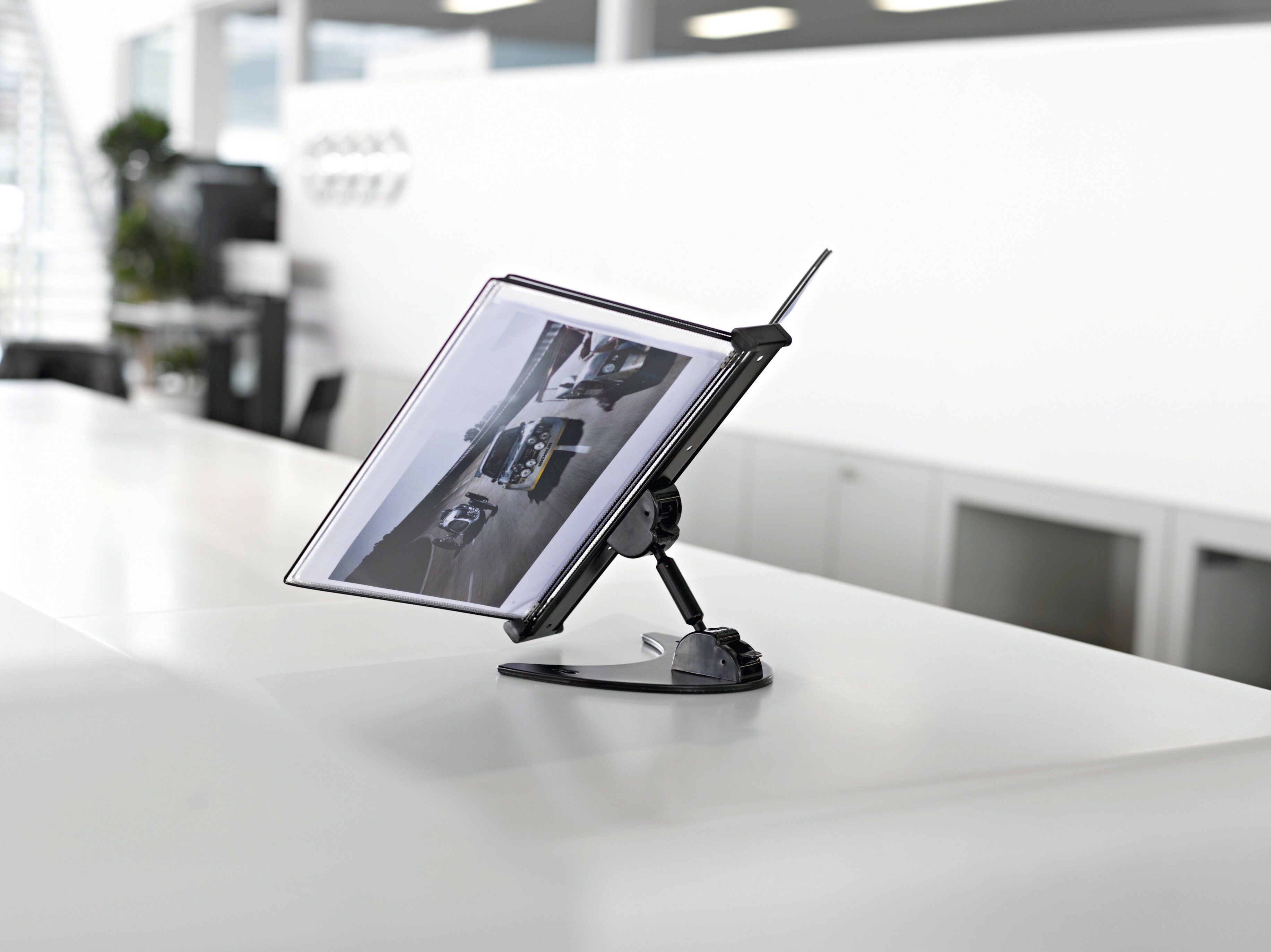 Stoni nosač sa 5 crnih ramova A4 formata sa posebnim zglobovima, pomoću kojih se može menjati orijentacija ramova. Može se montirati i na bilo koju vertikalnu površinu.