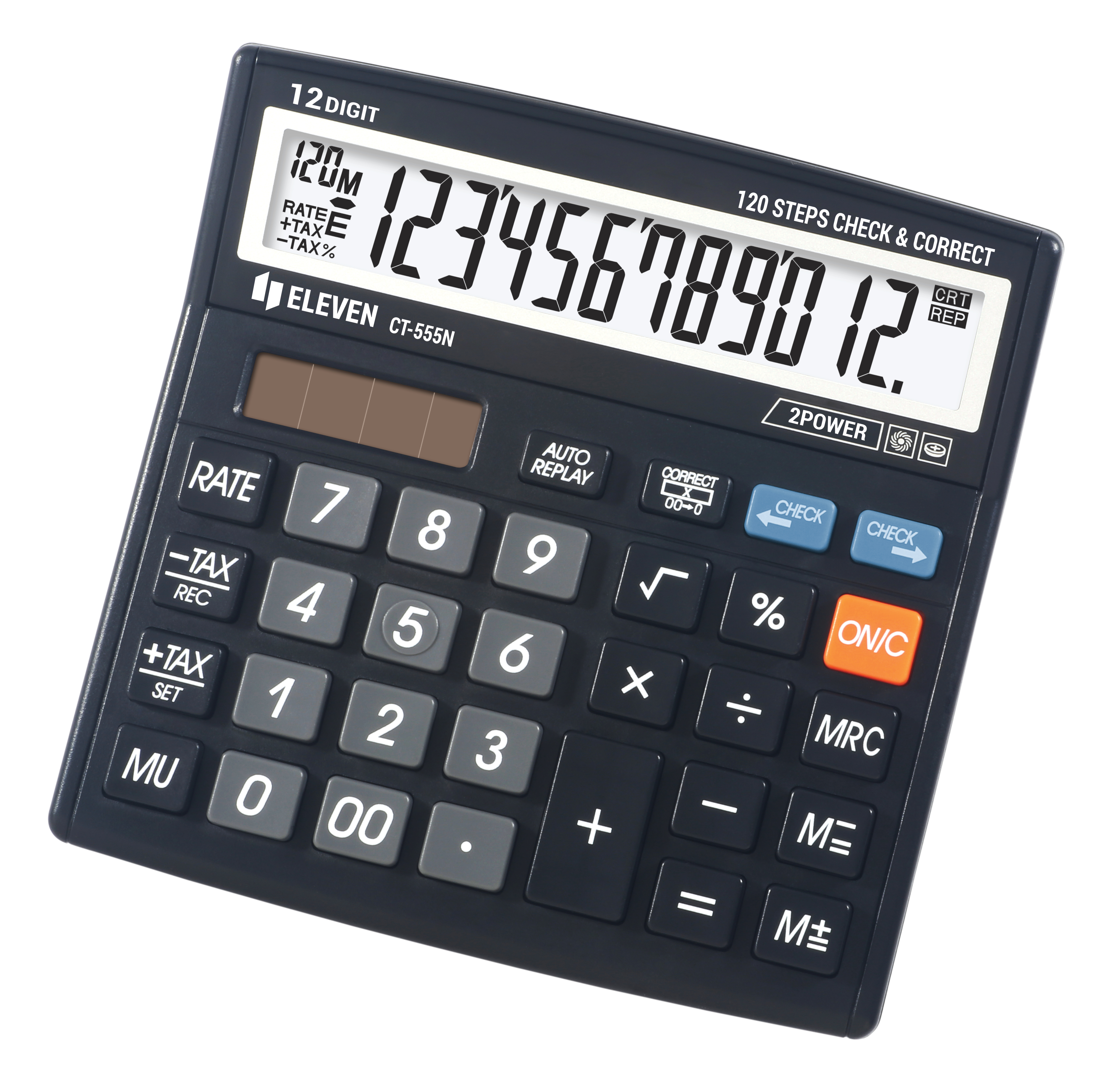 Stoni kalkulator: ekran od 12 cifara, 3 memorijska tastera: MRC, M +, M-, Mar up cena [MU], kvadratni koren, procenat [%], dupla nula [00], obračun poreza [TAKS], ček & ispravno (120 koraka) Dvostruko napajanje: baterija i solarna energija.