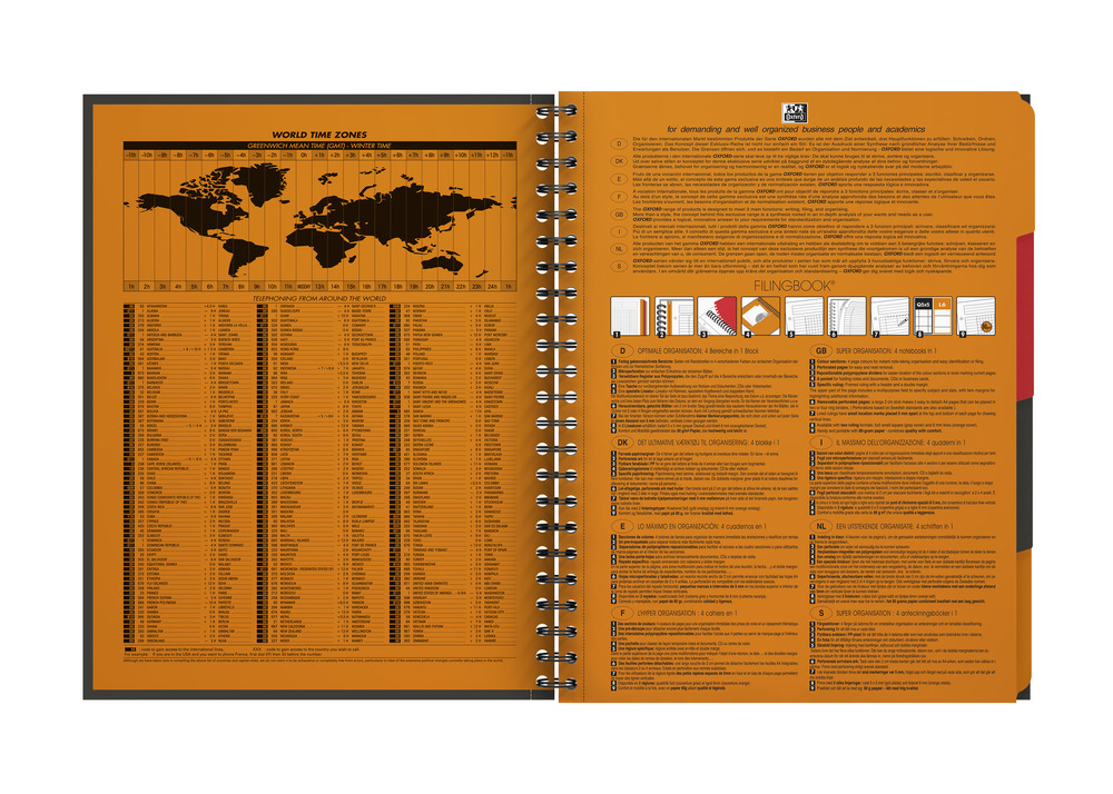 Filingbook sadrži 4 odeljka označena bojama i 3 pregrade koja se mogu ukloniti i premestiti da biste mogli da kreirate odeljke za različite projekte unutar sveske. Sadrži i džep za dokumente za skladištenje i transport beleški, dokumenata ili vizitkarti. Dostupan u veličini A4+, Filingbook ima kvadratnu mrežu od 5 mm i 200 unapred perforiranih i bušenih listova sa 4 rupe. Oksfordov ekskluzivni glatki, beli Optik Paper® od 80gsm visokog kvaliteta omogućava vam da pišete na obe strane stranice bez prodora mastila. Stranice su pametno postavljene i uključuju zaglavlje za pisanje naslova sastanka ili teme i datum i dvostruke margine za numerisanje tačaka ili isticanje radnji.