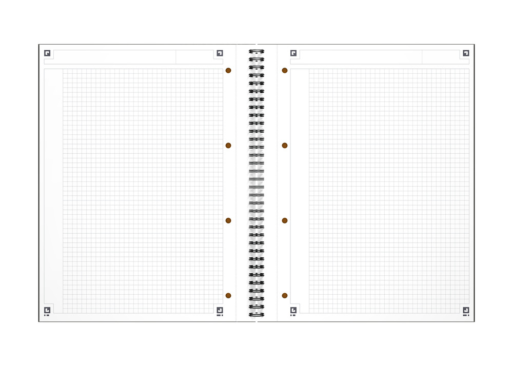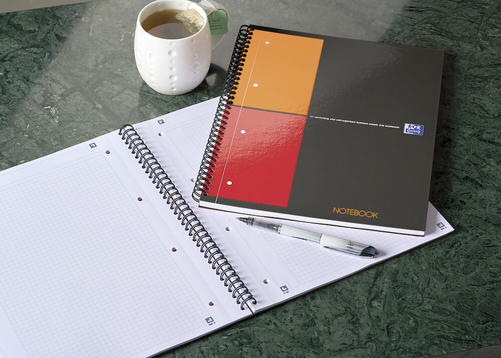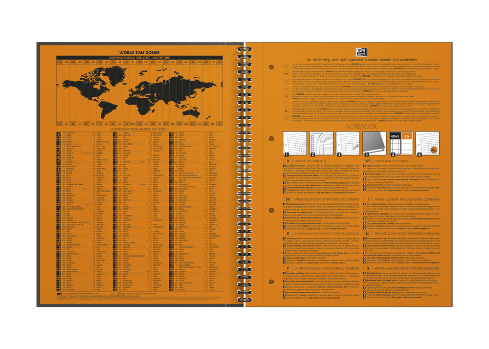 Laminirana, tvrdi povez, izdržljiva - u grafitno sivoj boji, pruža odličnu zaštitu za beleške i savršena je za vođenje beleški dok stojite. Sadrži informacije o međunarodnim pozivnim brojevima i vremenskim zonama, kao i savete na deset jezika. Stranice imaju dvostruke margine i zaglavlja, za efikasno beleženje napomena i naslova na stranicama. Stranice su bušene i perforirane za lako odlaganje u registrator/klaser. Rukopis se ne vidi sa suprotne strane. Crna dvostruka spirala omoguc´ava da se notebook otvori za 360°.