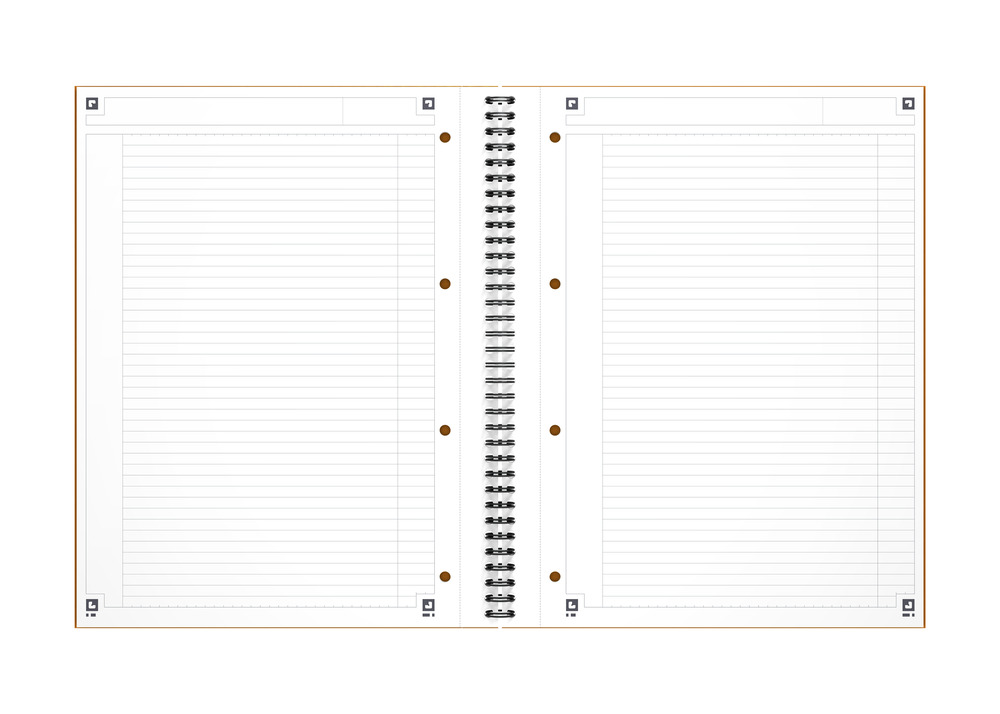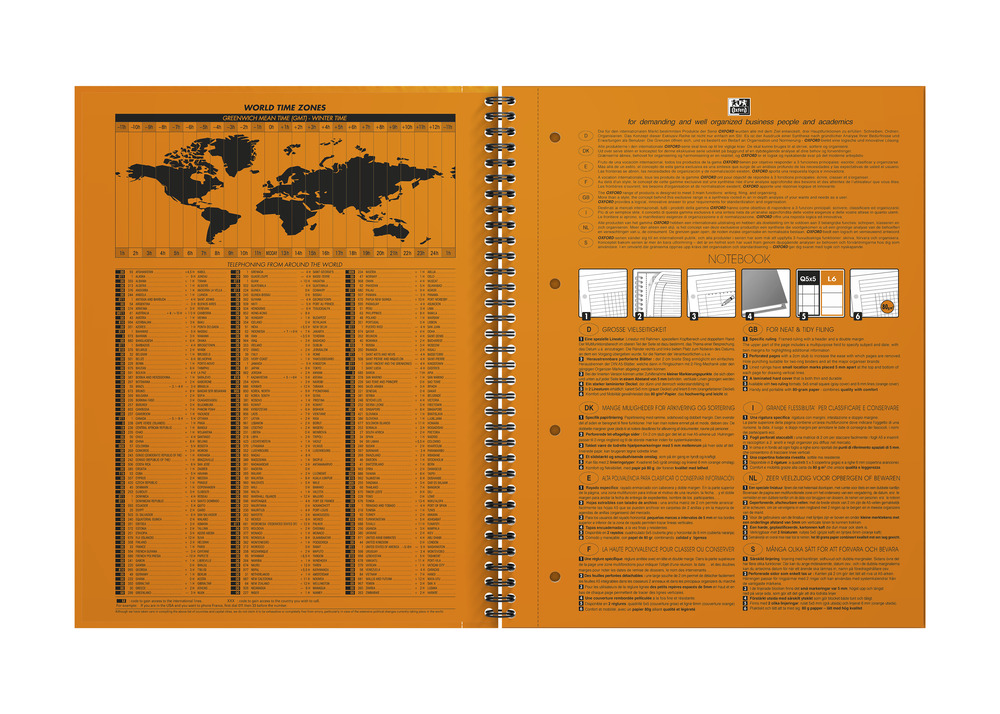 Laminirana, tvrdi povez, izdržljiva - u narandžastoj boji, pruža odličnu zaštitu za beleške i savršena je za vođenje beleški dok stojite. Sadrži informacije o međunarodnim pozivnim brojevima i vremenskim zonama, kao i savete na deset jezika. Stranice imaju dvostruke margine i zaglavlja, za efikasno beleženje napomena i naslova na stranicama. Stranice su bušene i perforirane za lako odlaganje u registrator/klaser. Rukopis se ne vidi sa suprotne strane. Crna dvostruka spirala omoguc´ava da se notebook otvori za 360°.