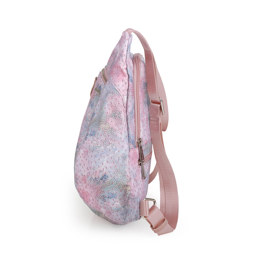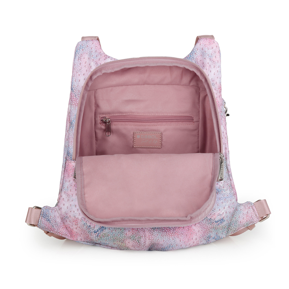 Kolekcija Nabila predstavlja potpuno osveženje, što se tiče boja palete boja, gde dominira roze, sa prelivima ka plavoj i sivoj. Ranac je veoma dobro organizovan: ima veliki prednji džep, dok se glavnom odeljku pristupa sa zadnje strane, iz sigurnosnih razloga, a sa te leđne strane se nalazi i još jedna zip pregrada za ključeve. Dugački srednju kaiš omogućava i nošenje preko ramena. Materijal je kombinacija vodootpornog poliestera i veštačke kože i nosi PVC free oznaku. Mali poklon uz svaku torbu: privezak za ključeve.