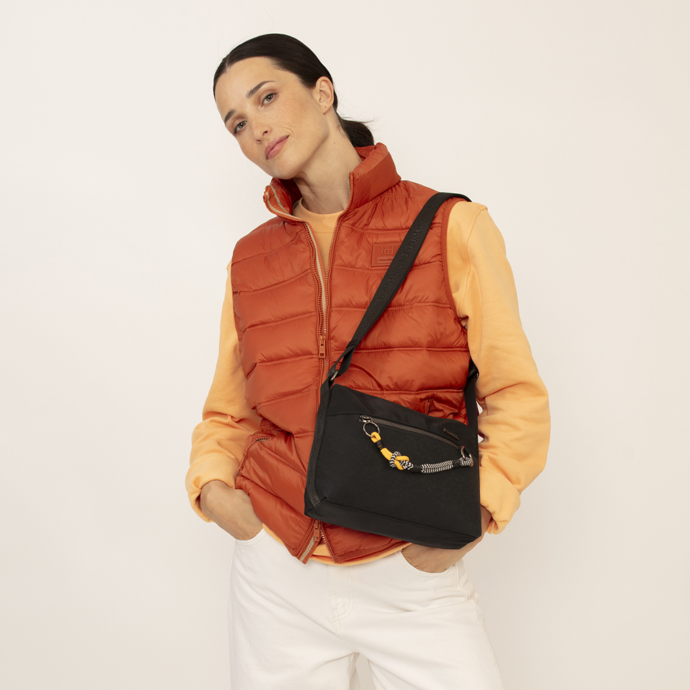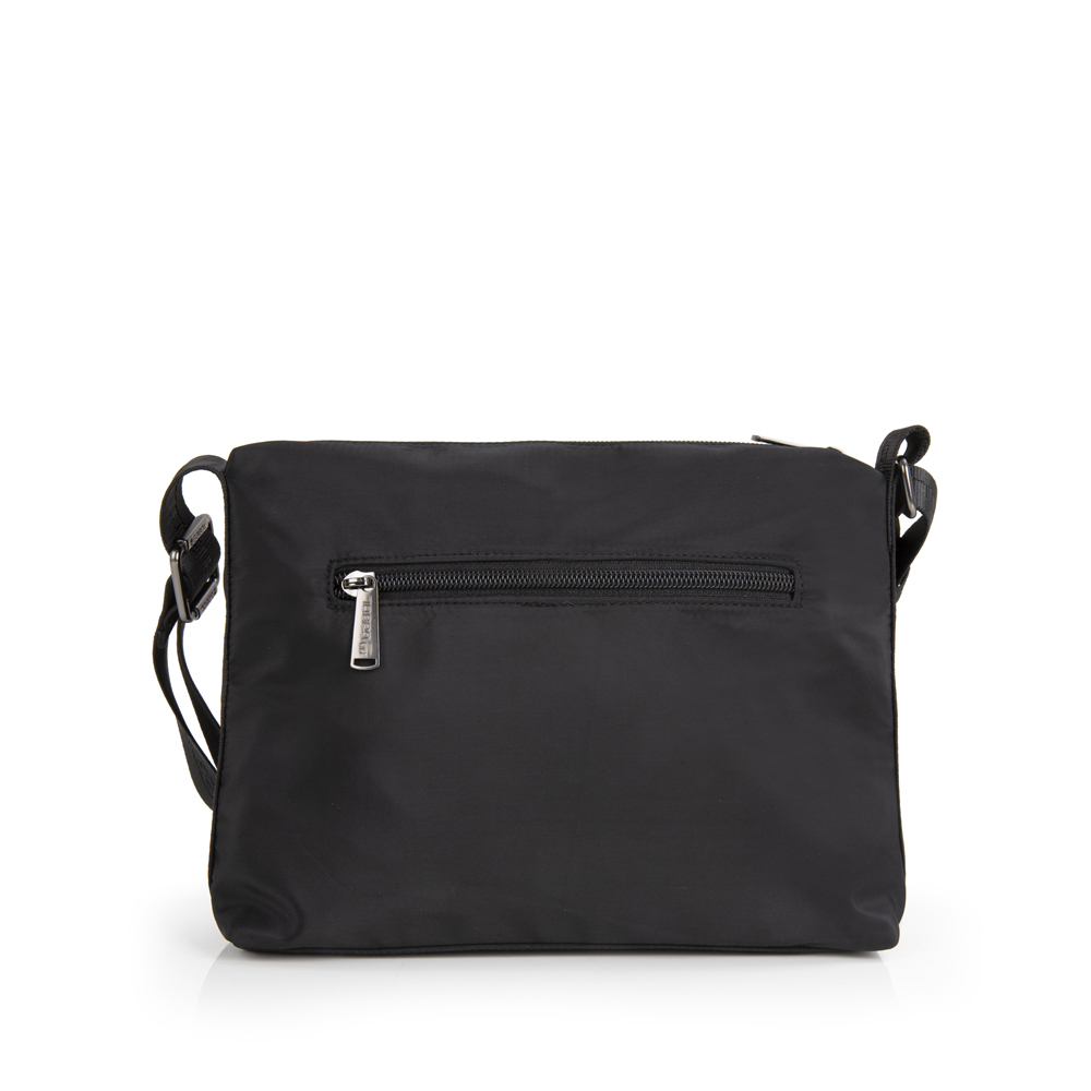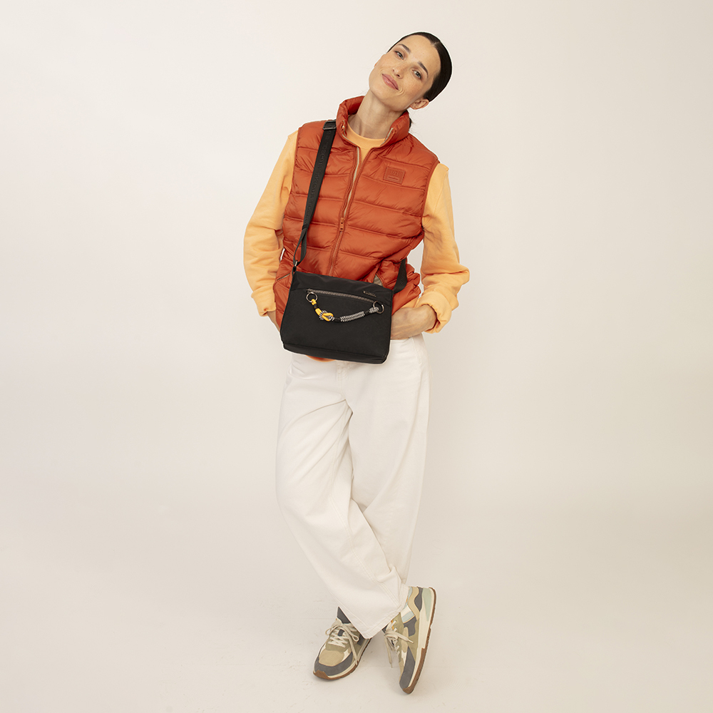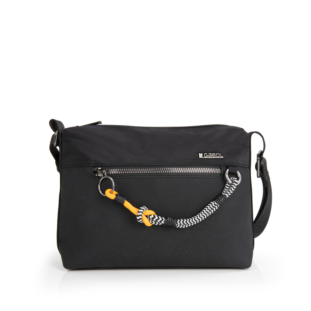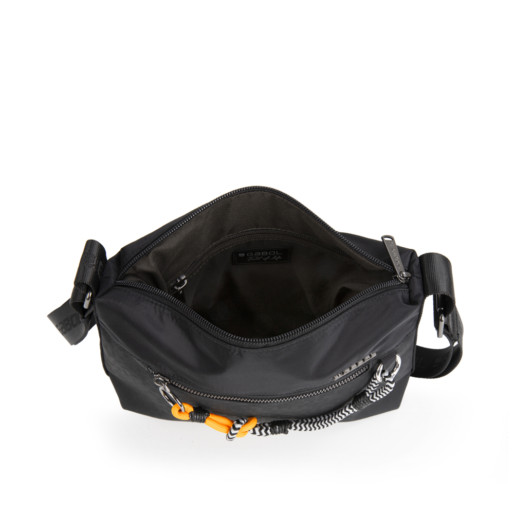 Moderna ženska torba, srednje veličine, napravljena od kombinacije sinteticke kože, bez "PVC" primesa, i sintetičkog poliestera. Glavni, smeštajni prostor je ujedno i najveći, i otvara se sa gornje strane, solidnog je kapaciteta. Postoji i unutrašnji manji džep sa zippom. Spoljašnji džep se zatvara kvalitetnim zippom, na kojem se nalazi atraktivni privezak od zebrastih pertli sa narandžastim detaljima.Na zadnjoj strani se nalazi dodatni džep za svakodnevne sitnice.