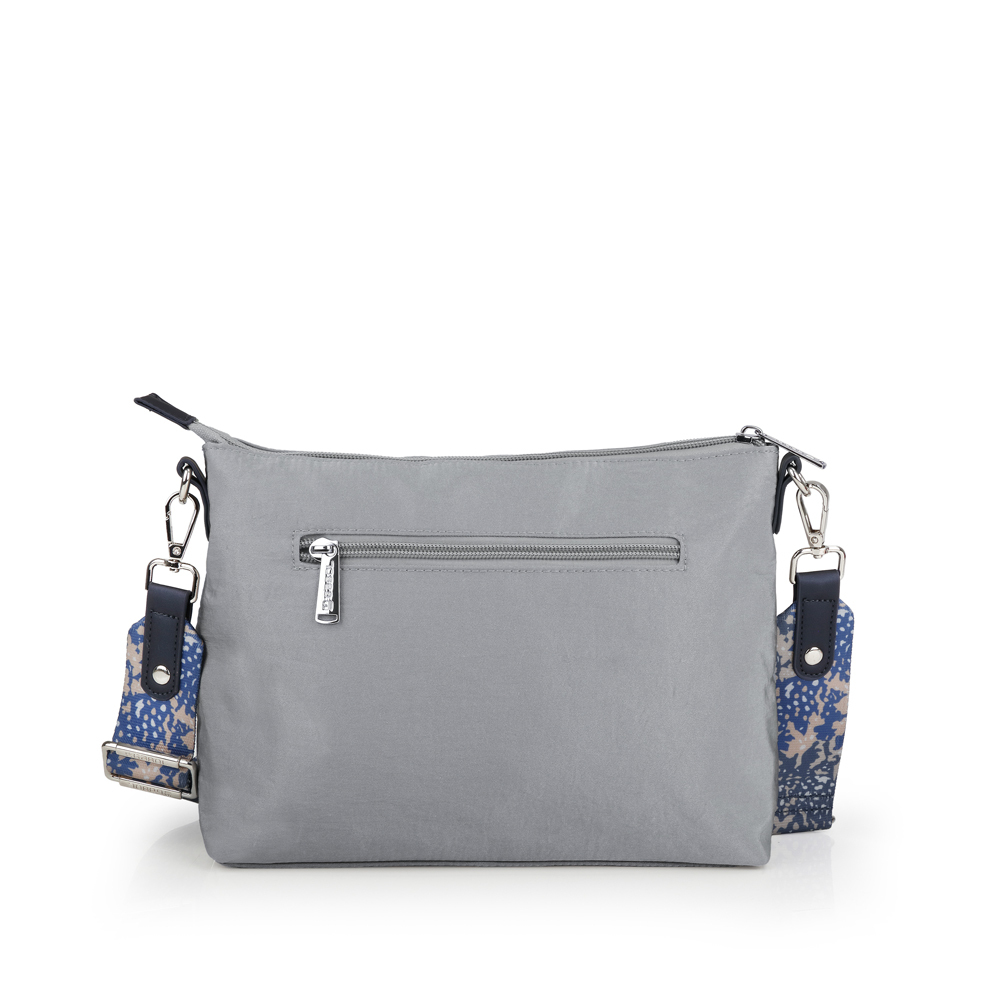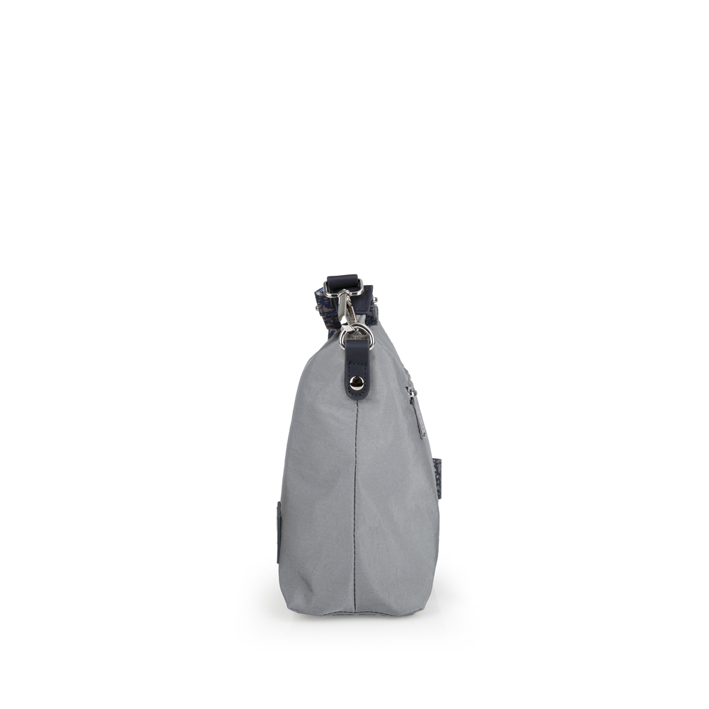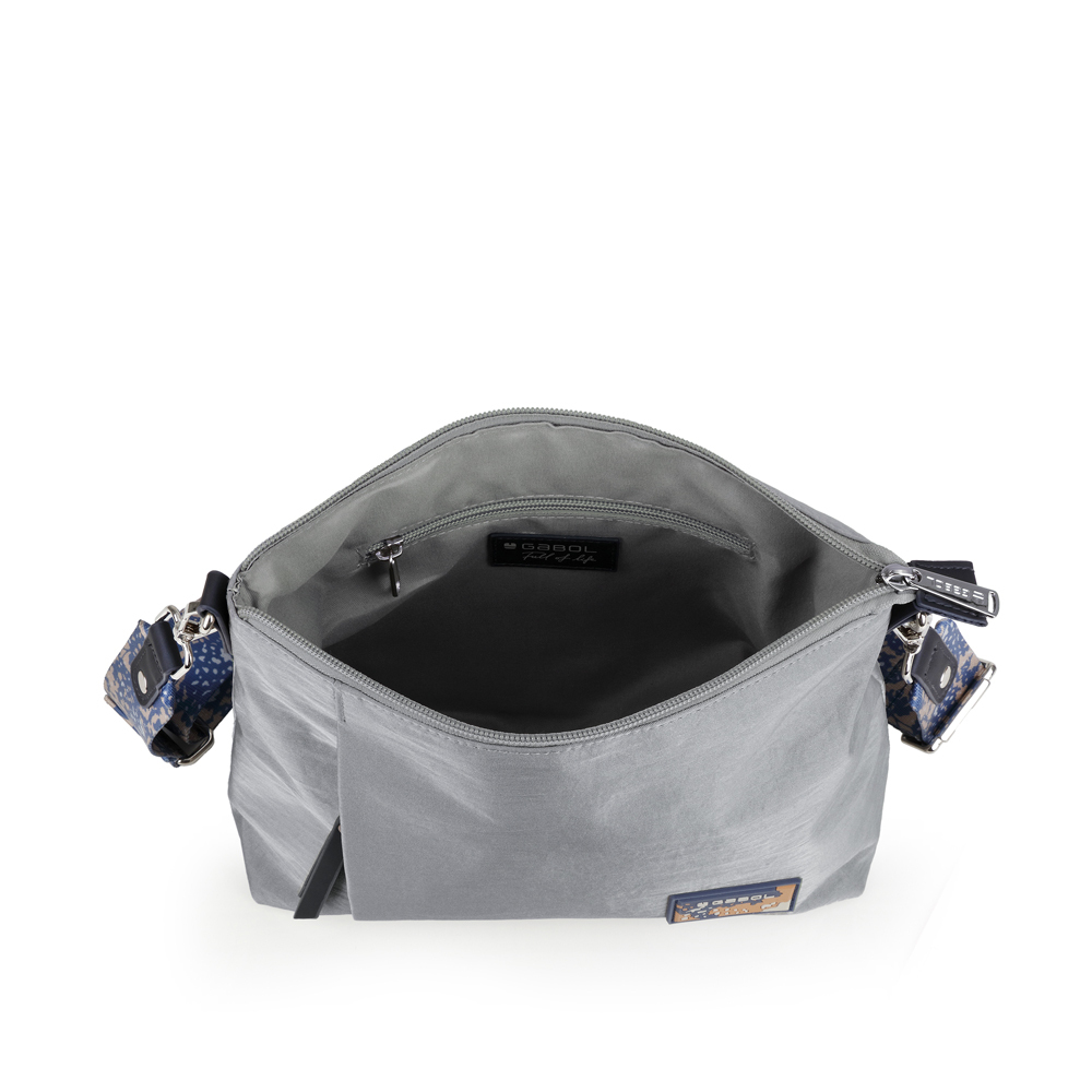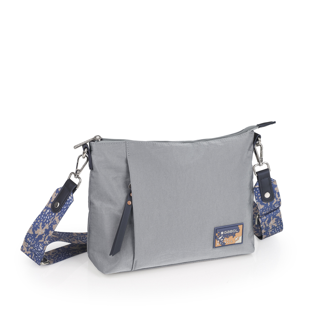 Torba srednje veličine, sa dekorativnim kaišem preko ramena interesantnog dizajna. Napravljena od kombinacije materijala, vodootpornog najlona i sintetičke kože, sa oznakom PVC free. Ima jednu centralnu pregradu sa malim unutrašnjim džepom. Na prednjoj strani se nalazi skriveni džep i bedž sa prepoznatljivim Gabol logom. Sa zadnje strane se nalazi još jedan dodatni džep, idealan za odlaganje svakodnevnih sitnica.