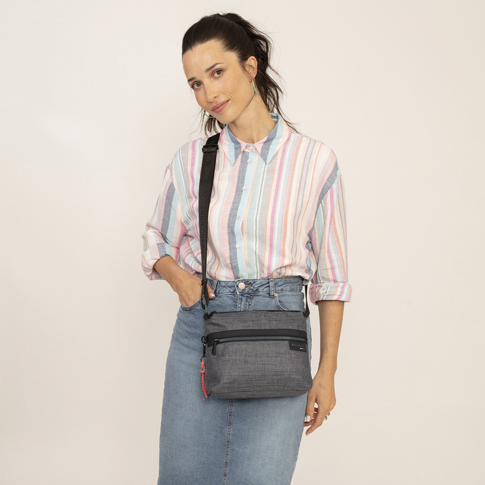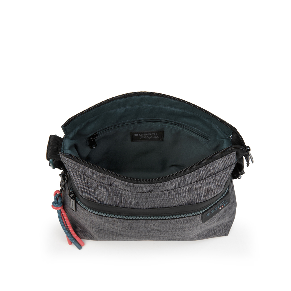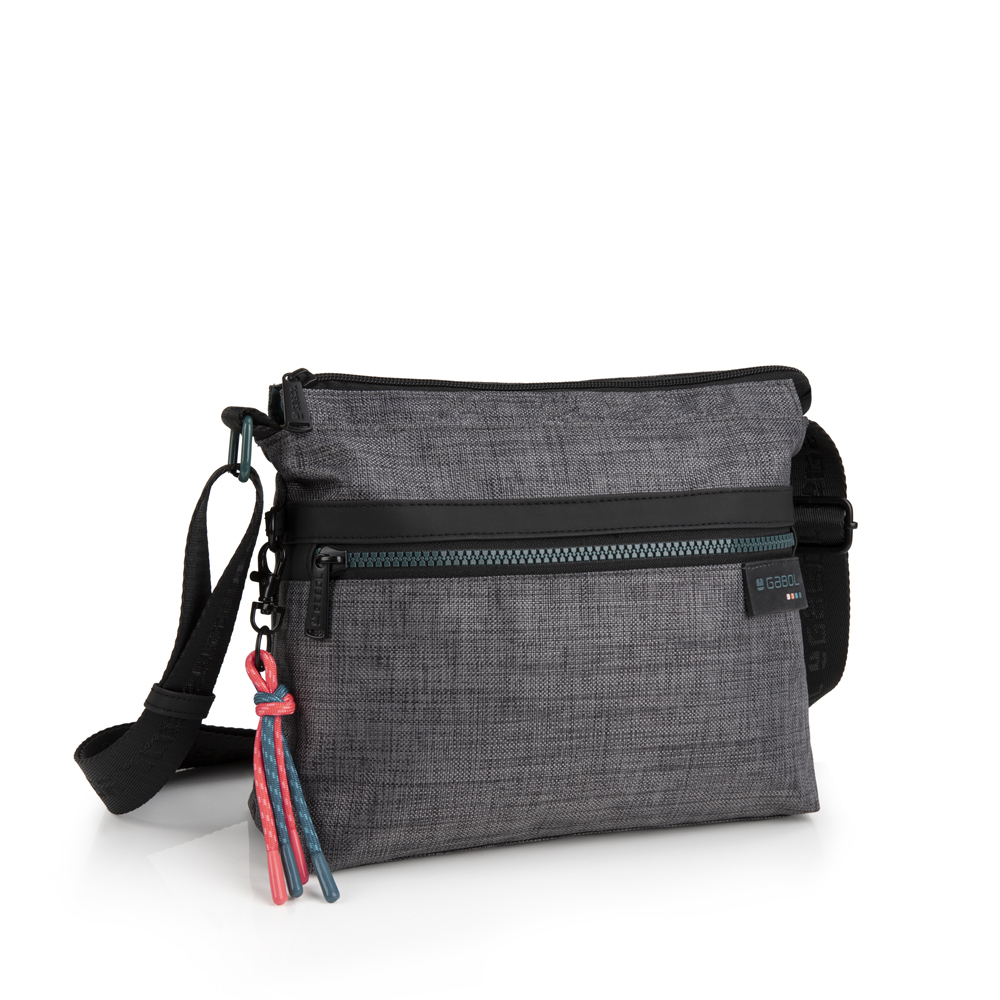 Savršeno organizovana torba za svaki dan u sivoj boji, manjih dimenzija. Izrađena od poliestera, PVC free materijala.Torba poseduje jednu glavnu pregradu, sa dodatnim unutrašnjim džepom. Sa prednje strane ima izdvojen džep koji se zatvara pomoću atraktivnog zipa u zelenoj boji. Sa zadnje strane torbe je dodatna manja sakrivena pregrada koja se takođe zatvara zipom. Uz svaku torbu se dobija privezak od pertlica u roze i petrolej boji.