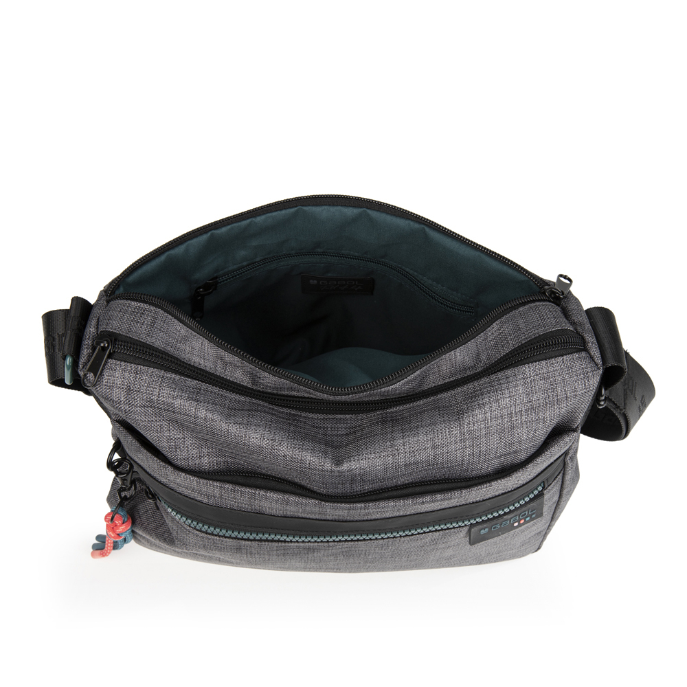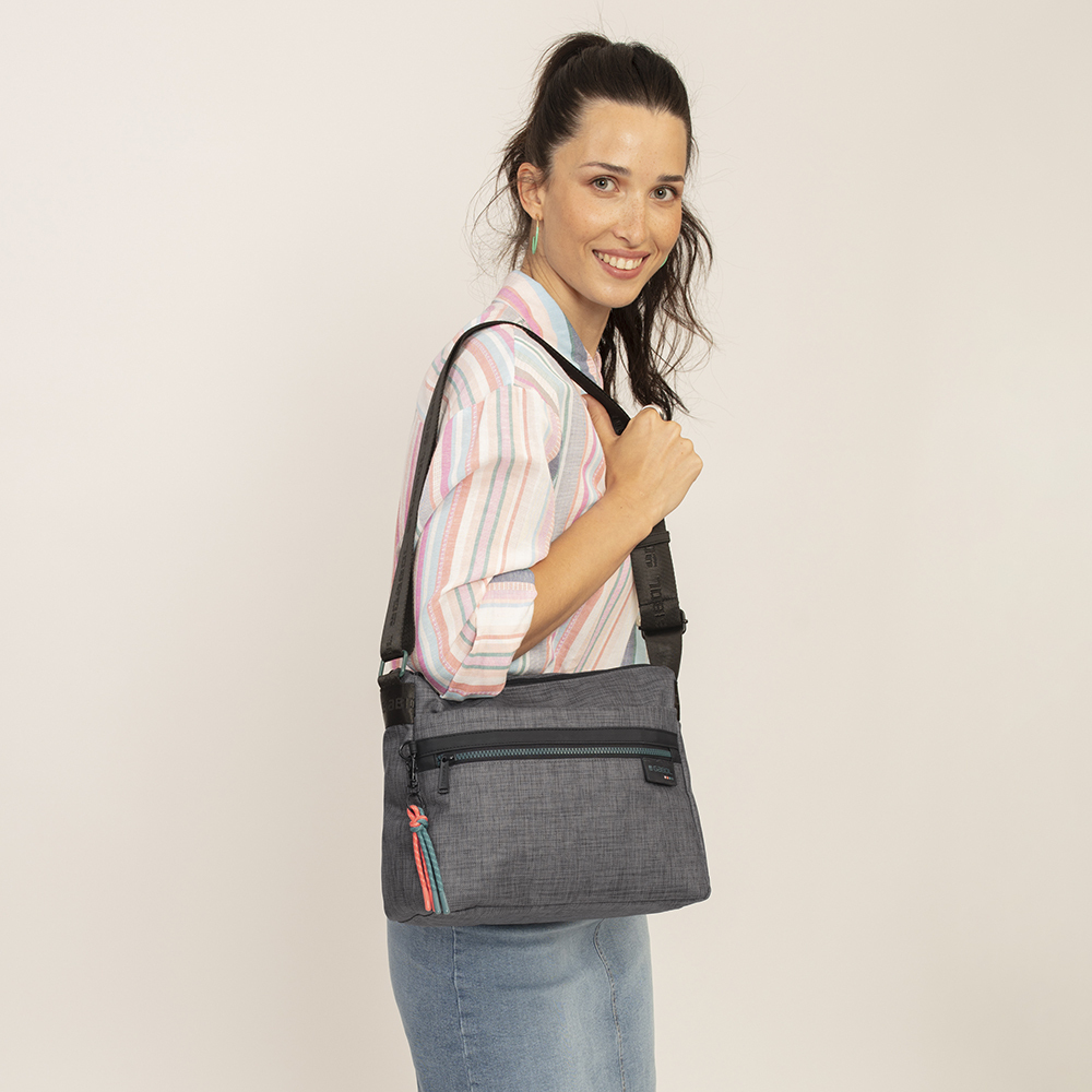 Savršeno organizovana torba za svaki dan u sivoj boji. Izradjena od poliestera, bez PVC primesa. Poseduje dve odvojene pregrade, koje omogućavaju odličnu organizaciju, čak i kod onih dama sa prevelikim brojem svakodnevnih sitnica. Sa prednje strane se nalaze dva dodatna džepa, jedan se zatvara dekorativnim zelenim zipom, a drugi skrivenim zipom. Na zadnjoj strani takodje postoji dodatni džep koji se zatvara zipom. Uz svaku torbu se dobija privezak od pertlica u roze i petrolej boji.