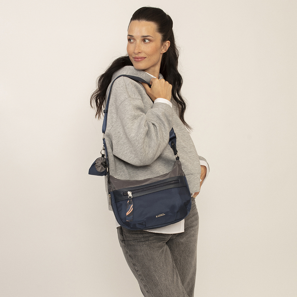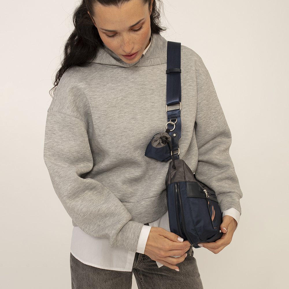 Kežual torba, idealne veličine sa opcijom povećanja prostora (proširova do 4 cm). Izradjena je od kombinacije kvalitetne sintetičke kože i sintetičkog poliestera, vodonepropusnog materijala, bez PVC primesa. Poseduje jednu prostranu glavnu pregradu, sa unutrašnjim džepom koji se zatvara zipom. Sa prednje i zadnje strane se nalaze dodatni džepovi. Uz svaku torbu dobijate mini privezak vrećicu, koja se zatvara učkurom, idealnu sa skrivene sitnice.