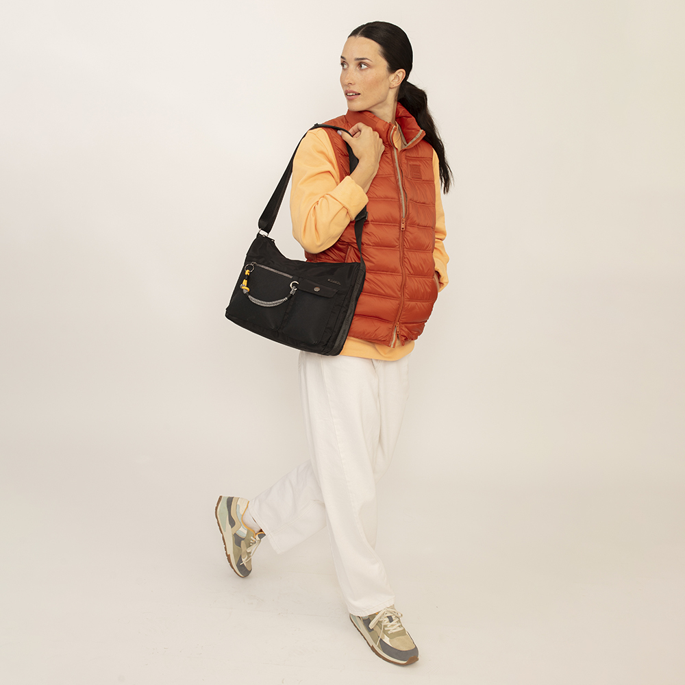 Torba ženska Aisha je torba za svakodnevnu upotrebu. Izradjena od kombinacije kvalitetne sintetičke kože i sintetičkog poliestera, bez PVC primesa, koji osigurava dugotrajnost i lako održavanje. Sadrži dve glavne pregrade, za bolju organizaciju vaših stvari. Sa prednje strane se nalaze dva džepa, jedan se zatvara dugmetom i idealan je za telefon, a u drugi možete smestiti lična dokumenta, ključeve i druge svakodnevne sitnice. Na prednjem džepu se nalazi atraktivni privezak od zebrastih pertli sa narandžastm detaljima. Ovaj model je idealan za žene koje vole veliki broj džepova i lako uklopiv dizajn.