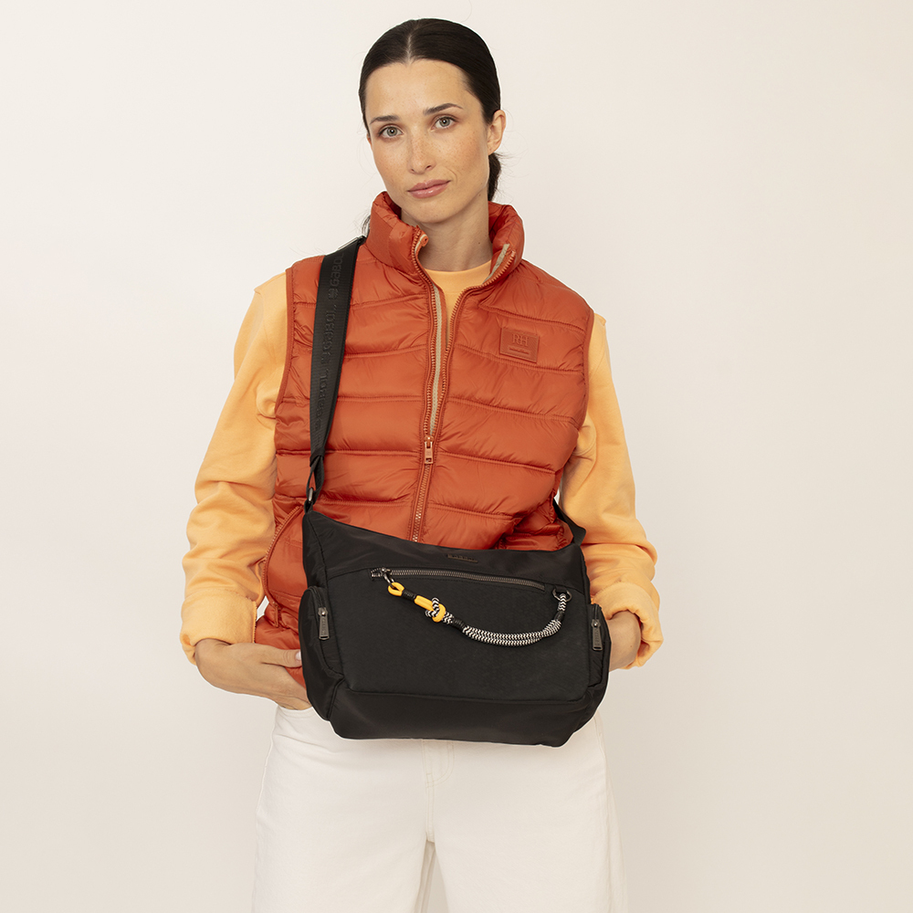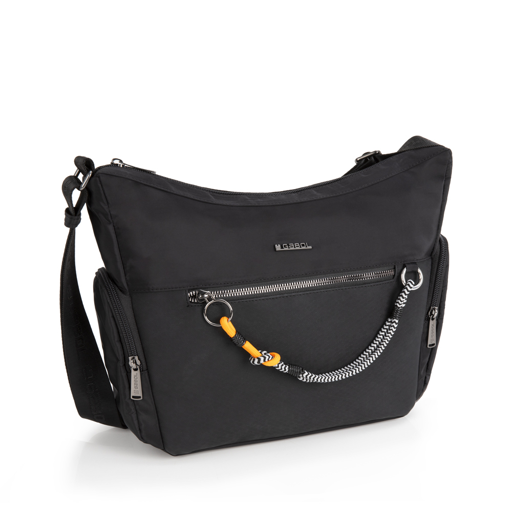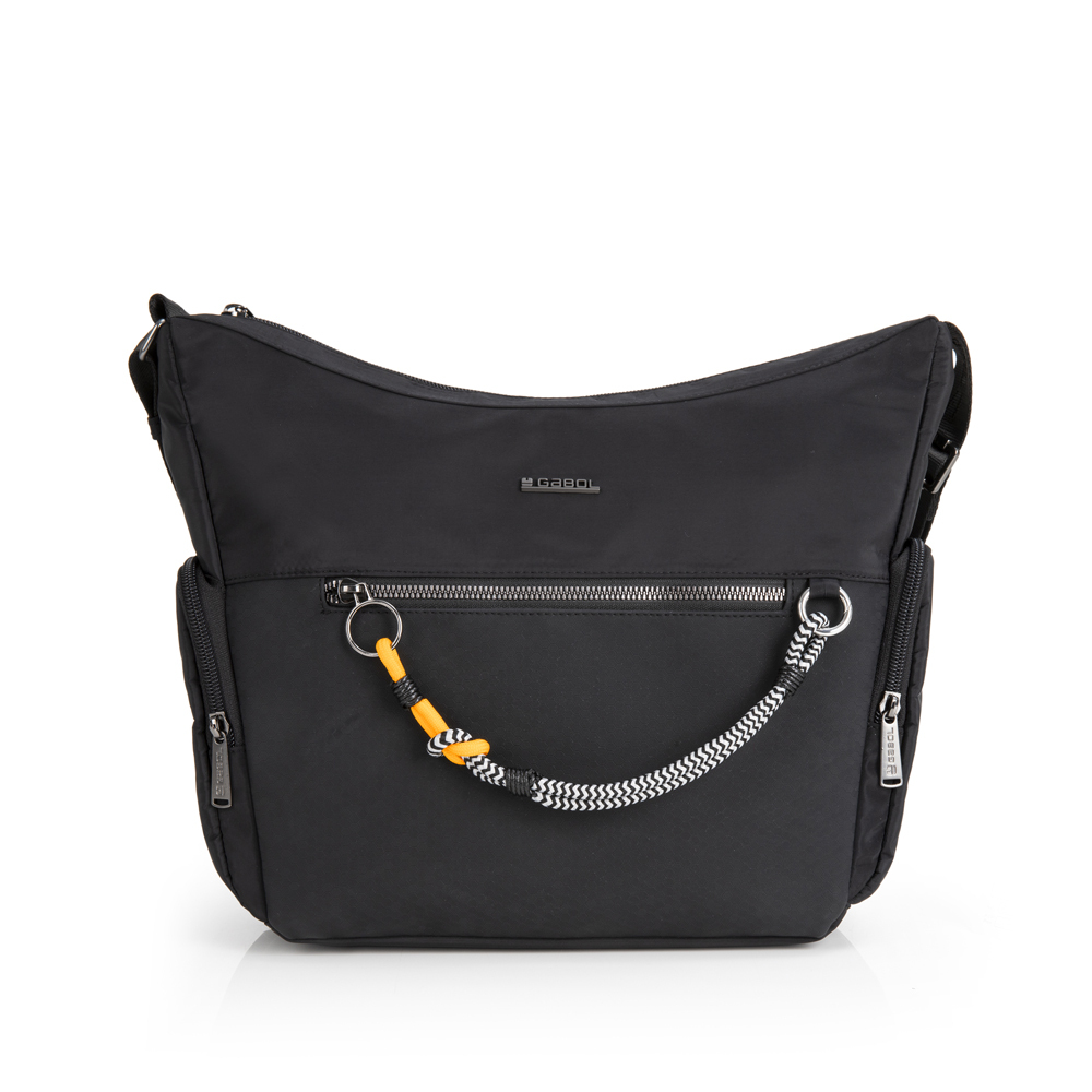 Torba ženska izradjena od kombinacije sintetičke kože i sintetičkog poliestera, bez PVC primesa, sa kaišem preko ramena i dekorativnim priveskom izradjenim od zebrastih pertli sa narandžastim detaljima. Torba ima idealnu organizaciju: prednji džep, jedna glavna pregrada sa unutrašnjim malim odeljkom, sa zadnje strane se nalazi još jedan dodatni džep, svi sa zip zatvaranjem. Na bočnim stranama se nalaze dodatni džepovi, koji ovaj model čine idealnim za sve ljubiteljke torbi sa velikim brojem džepova.