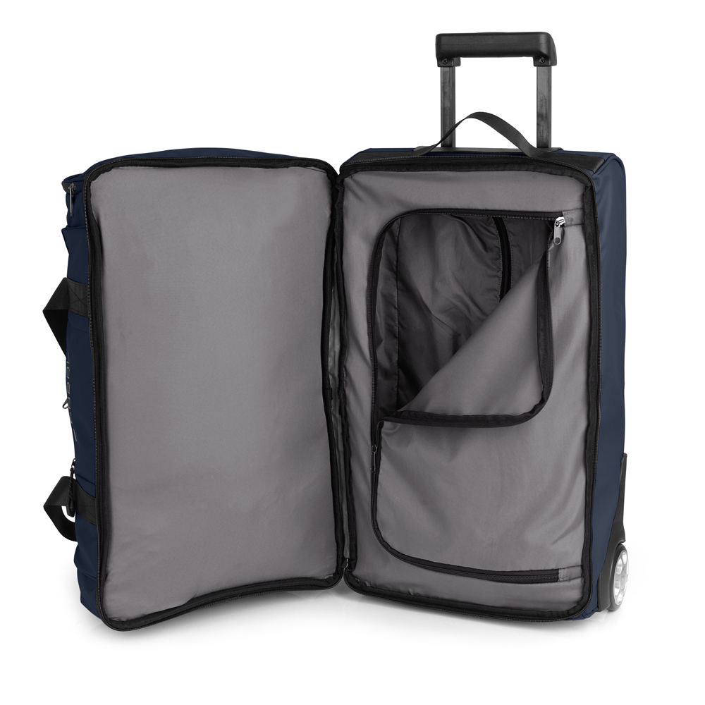 Veoma praktična putna torba sa dva točka. Sadrži dva odeljka: donji, koji se zatvara zipo-om, kao kod kofera i gornji, koji se pakuje sa gornje strane torbe. Kapacitet od 51l je sasvim solidan, čak i za duža putovanja. Dimenzije: 55x32x29 cm. Materijal: kombinacija postavljenog poliestera i veštačke kože.