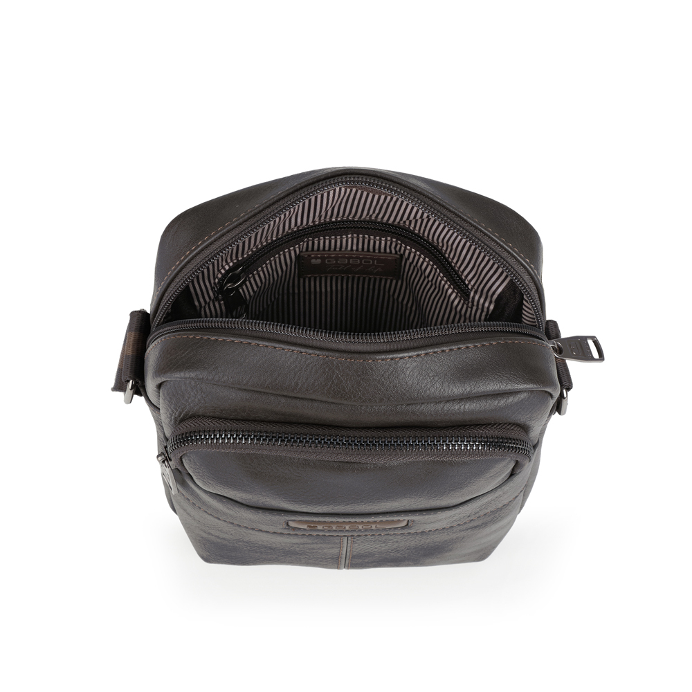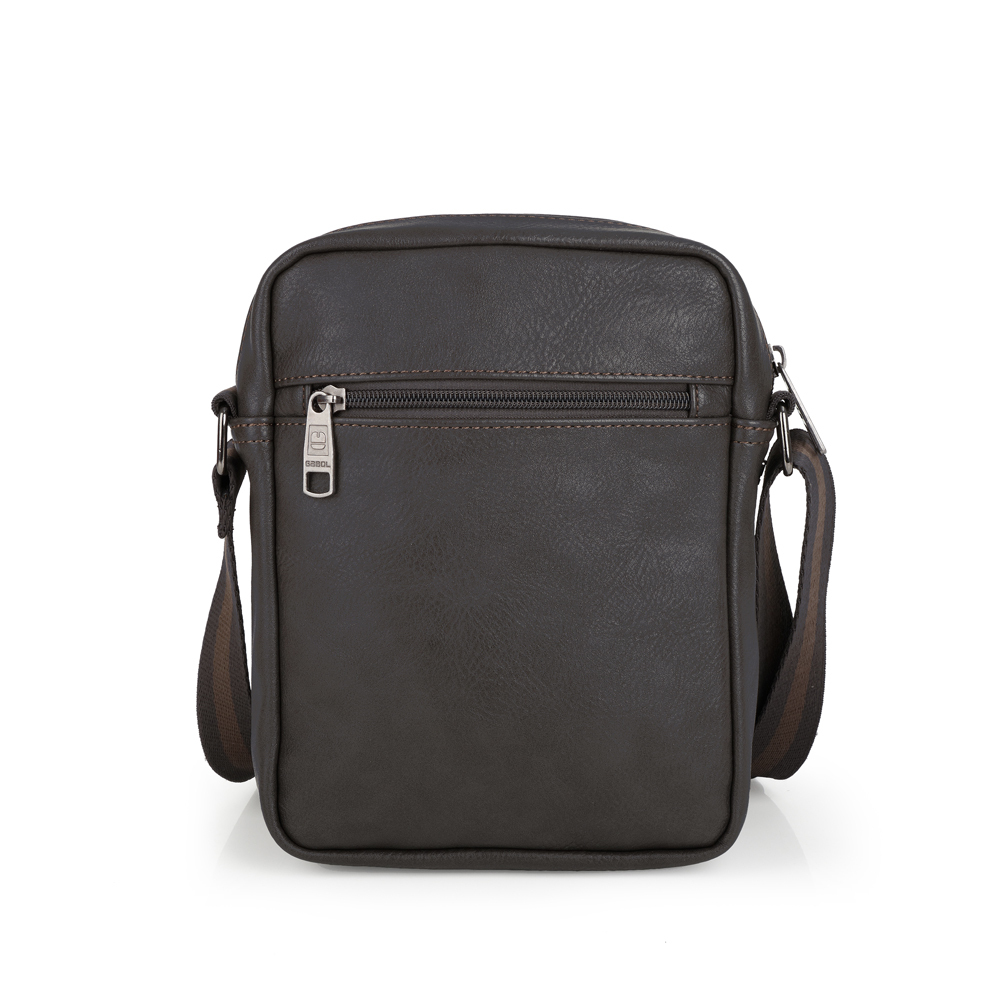 Moderna muška torba od sintetičke kože na rame. Sve pregrade su zaštićene kvalitetnim metalnim zip sistemom, dok je unutrašnjost opšivena kvalietnom postavom. Džep sa zadnjestrane i prednje se takođe zatvara zipom. Dimenzije 18 x 22 x6 cm