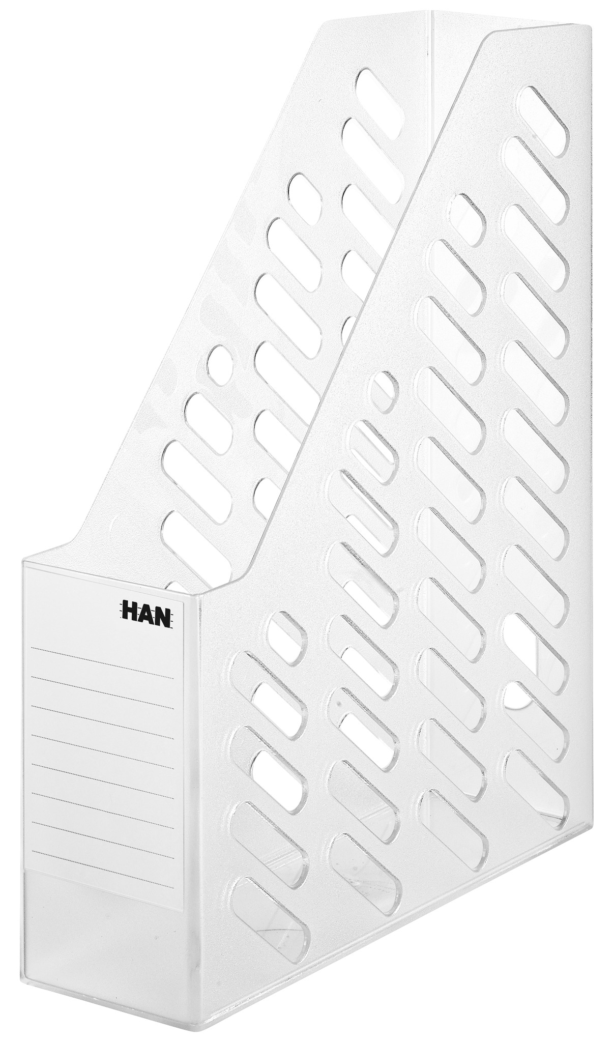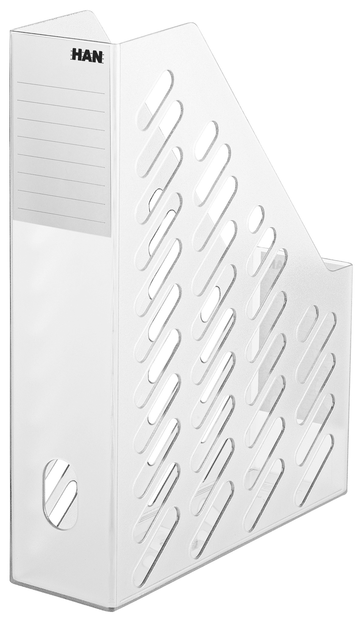 Uspravni držač/organajzer kataloga iz BRILLIANT kolekcije, klasičan i moderno dizajniran u transparentnoj varijanti koja se uklapa u svako okruženje. Ekstra visoka prednja strana za bezbedno držanje dokumenata. Pogodan za čuvanje dokumenata do DIN A4/C4. Kapacitet: 70 mm. Izrađen je od visokokvalitetne plastike (polistiren PS).