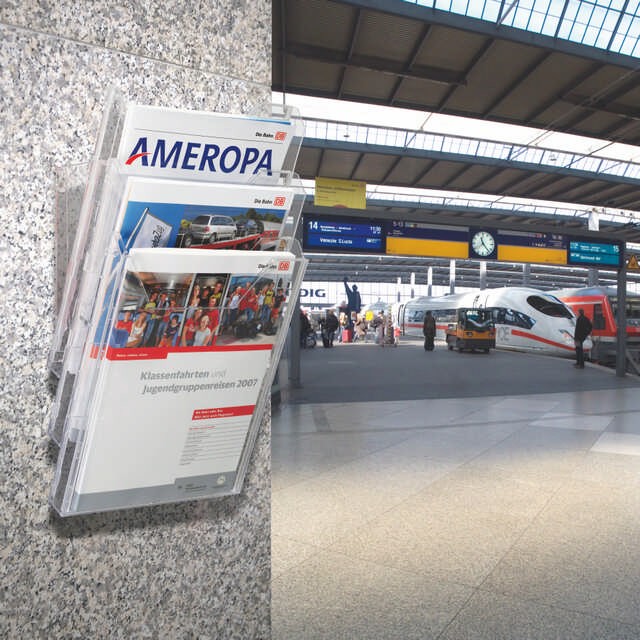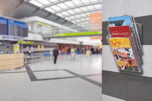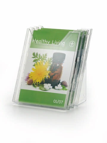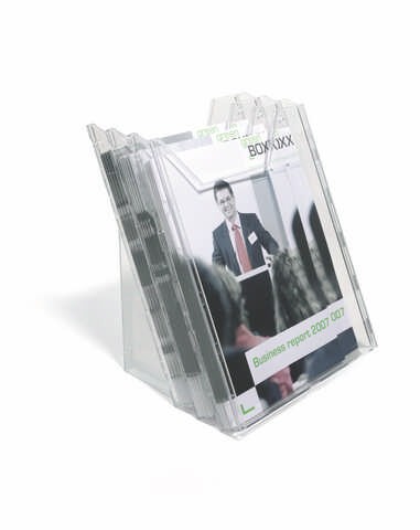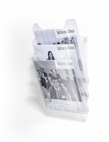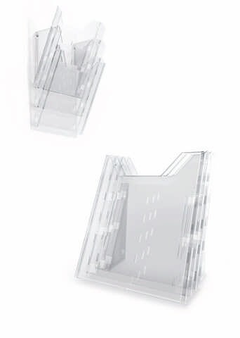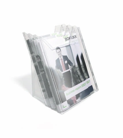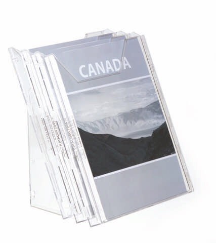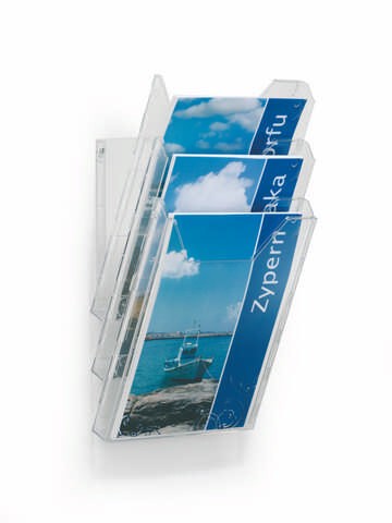 Stalak sa tri odeljka za prospekte formata A4 (odeljci dimenzije 311 x 240 mm).Može se kačiti na zid, ili postaviti na sto.Dimenzije (na stolu): 291 x 242 x 217 mm.Dimenzije (na zidu): 445 x 242 x 152 mm.